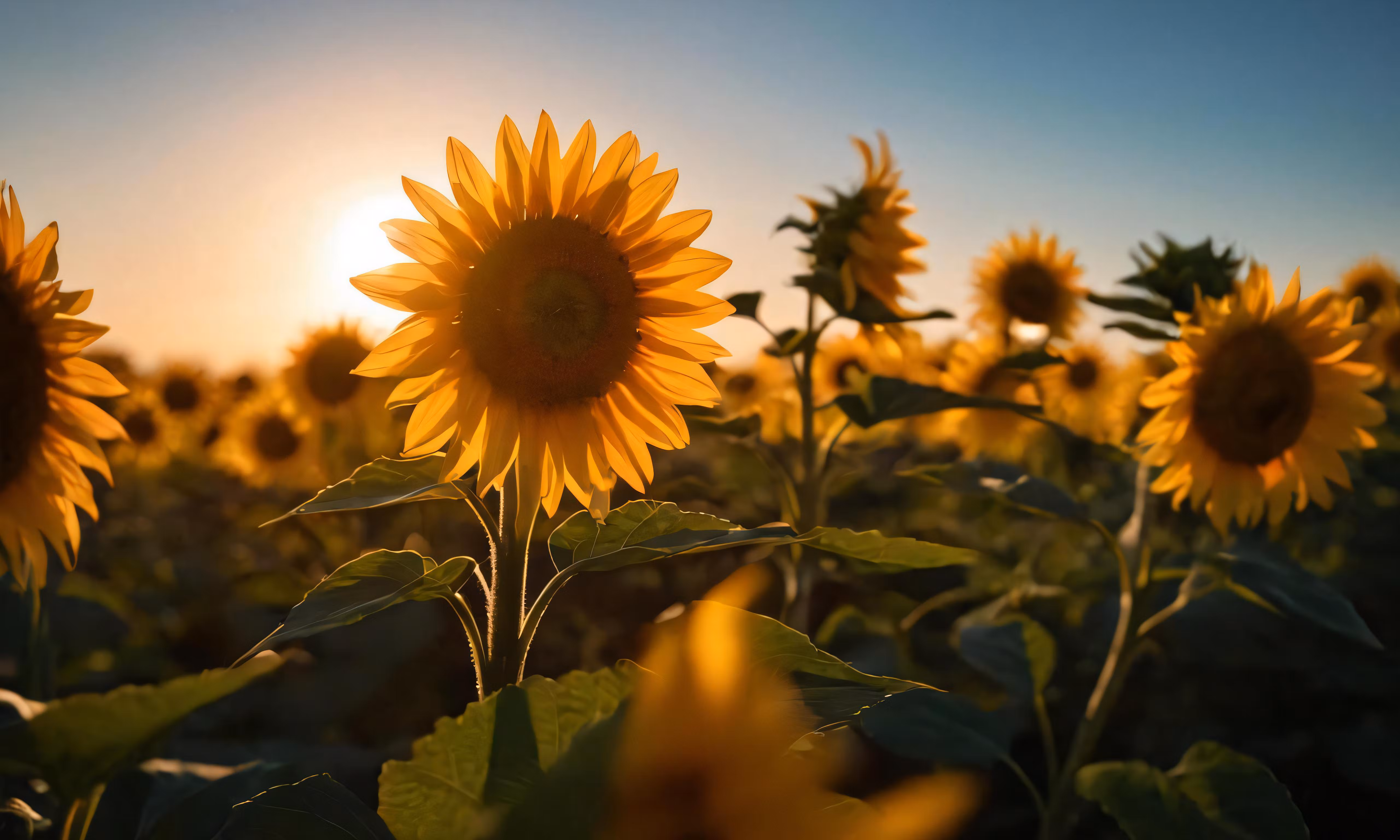 High resolution picture, free to use, a sunflower is in the center of a field with the sun setting