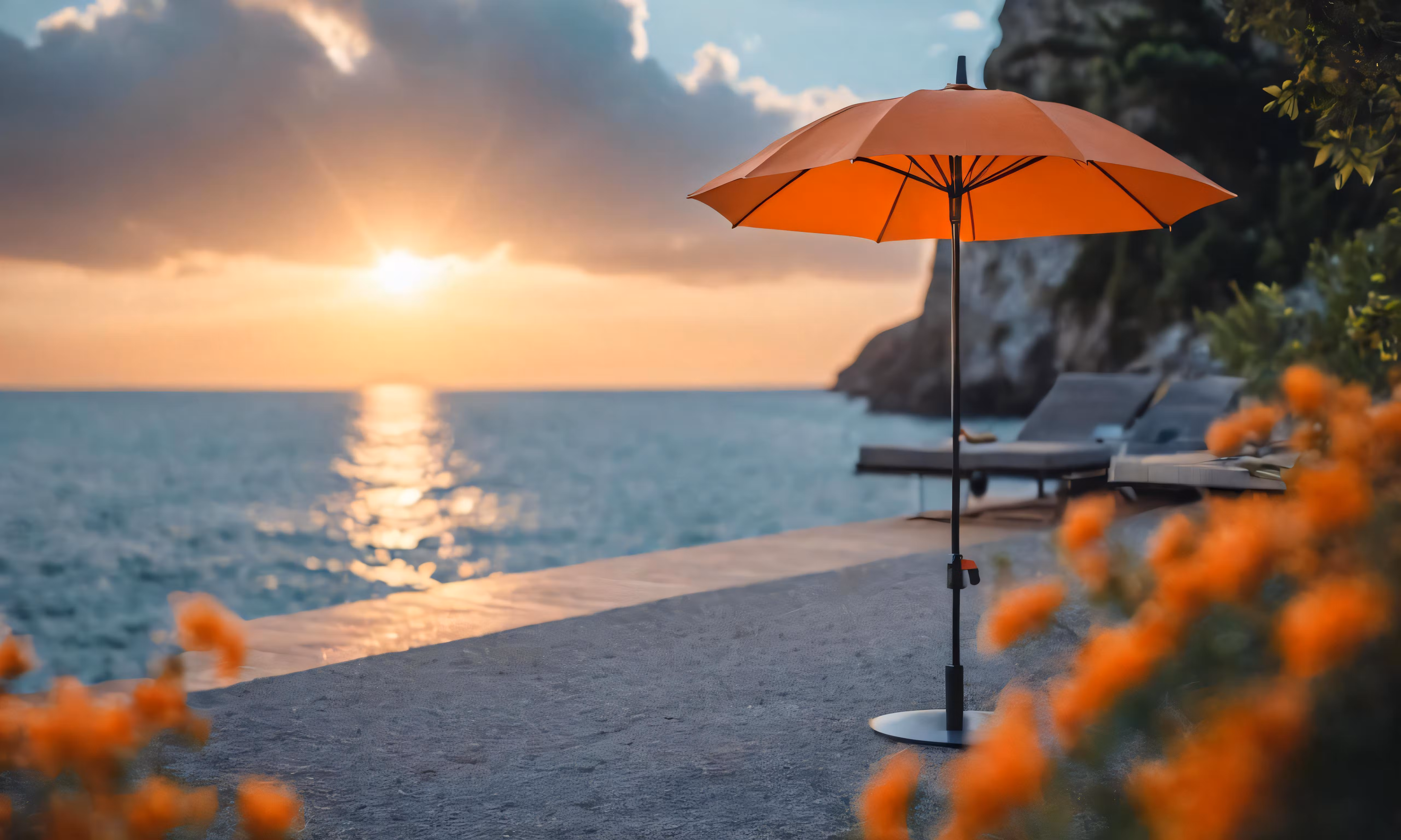 High resolution picture, free to use, a sunset over the ocean with an umbrella