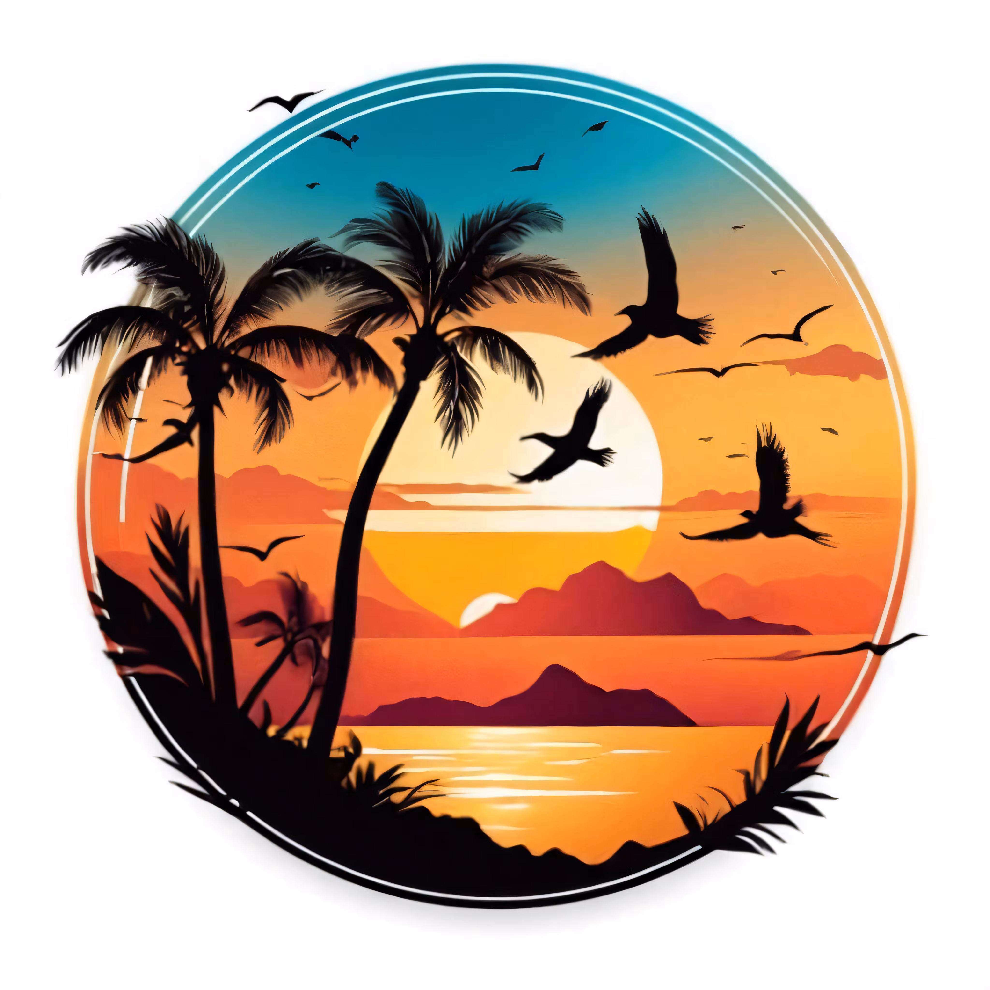 High resolution picture, free to use, a sunset scene with birds flying over the beach and mountains