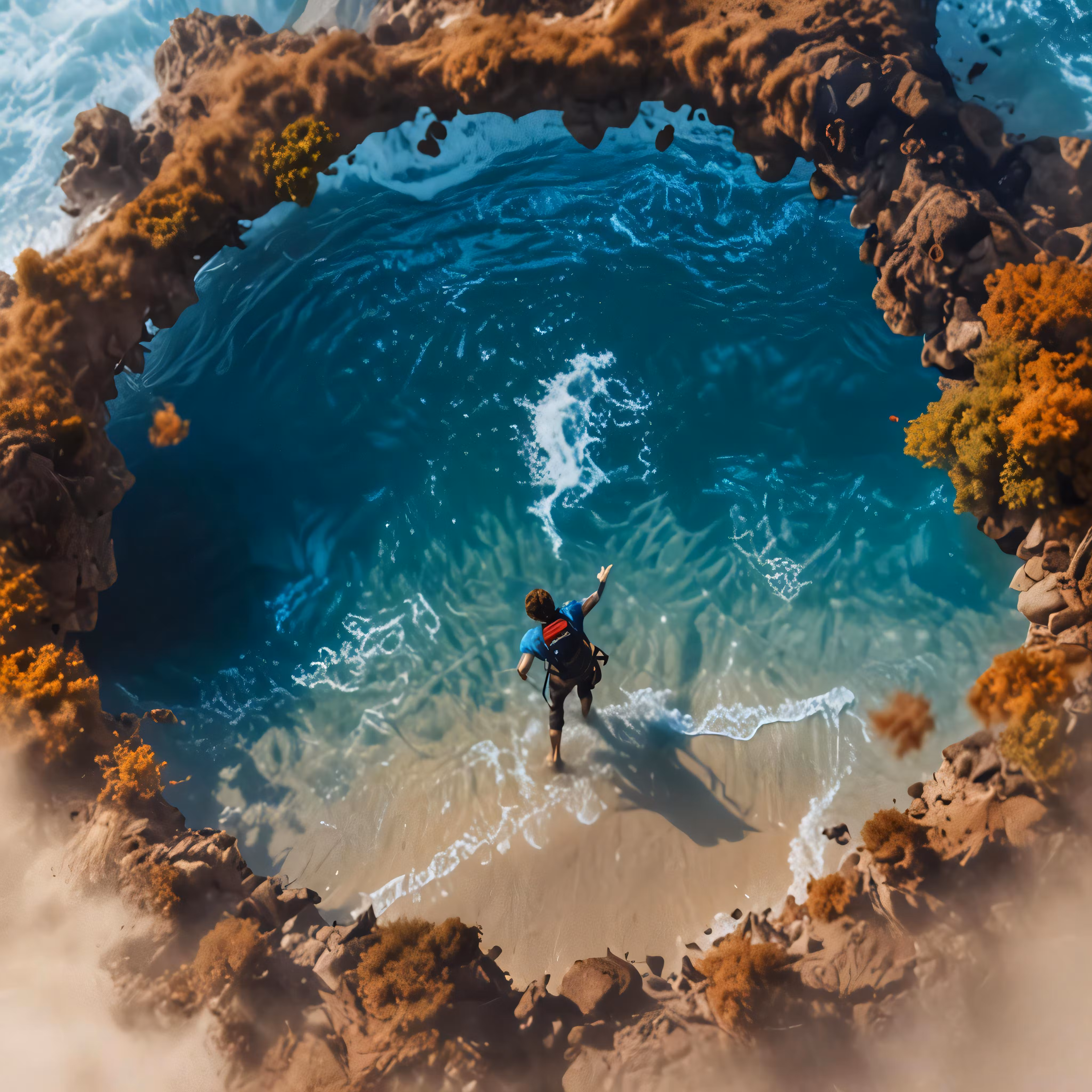 High resolution picture, free to use, a surfer riding a wave through the water, surrounded by coral