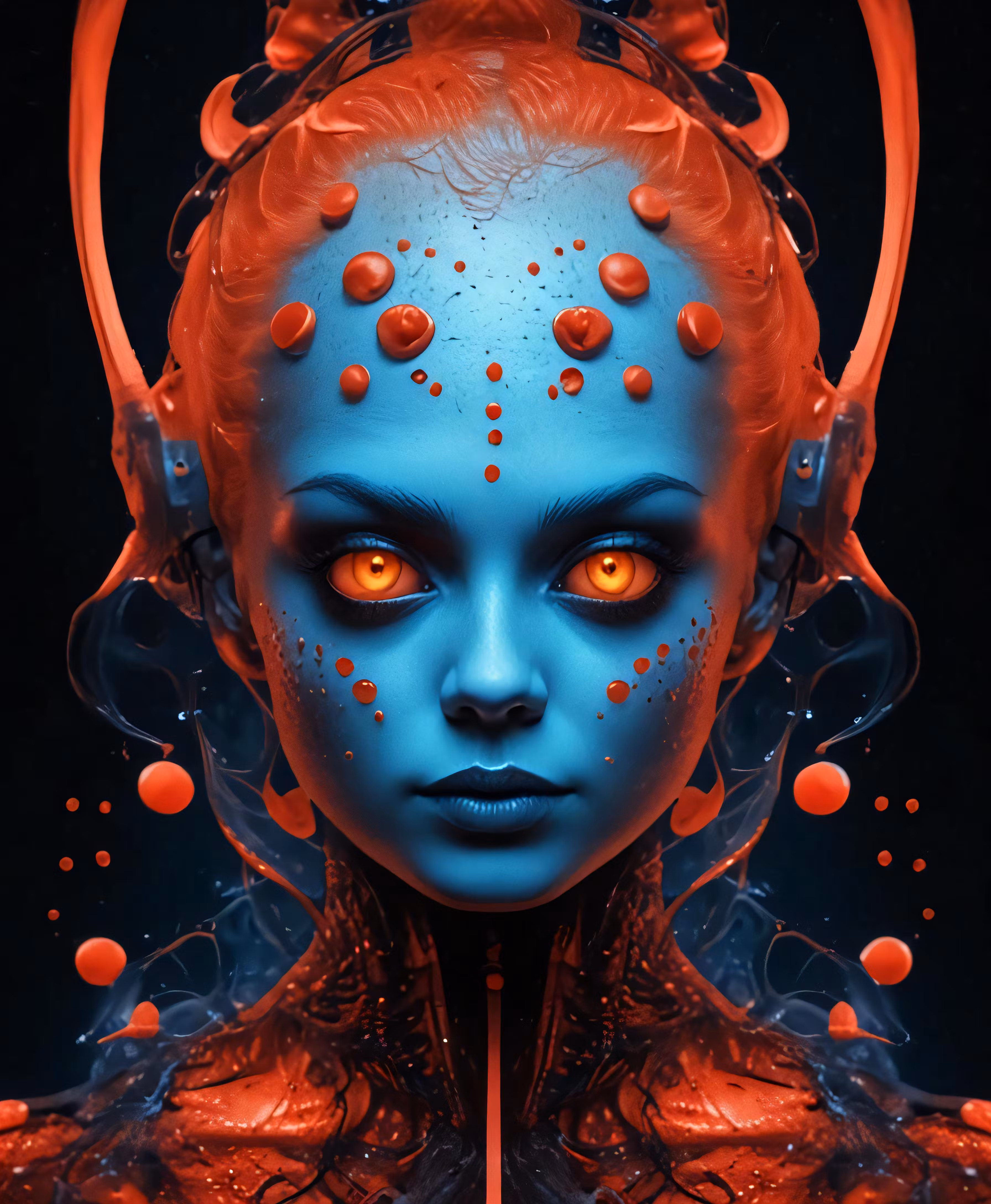 High resolution picture, free to use, a surreal blue and orange face with red circles around it