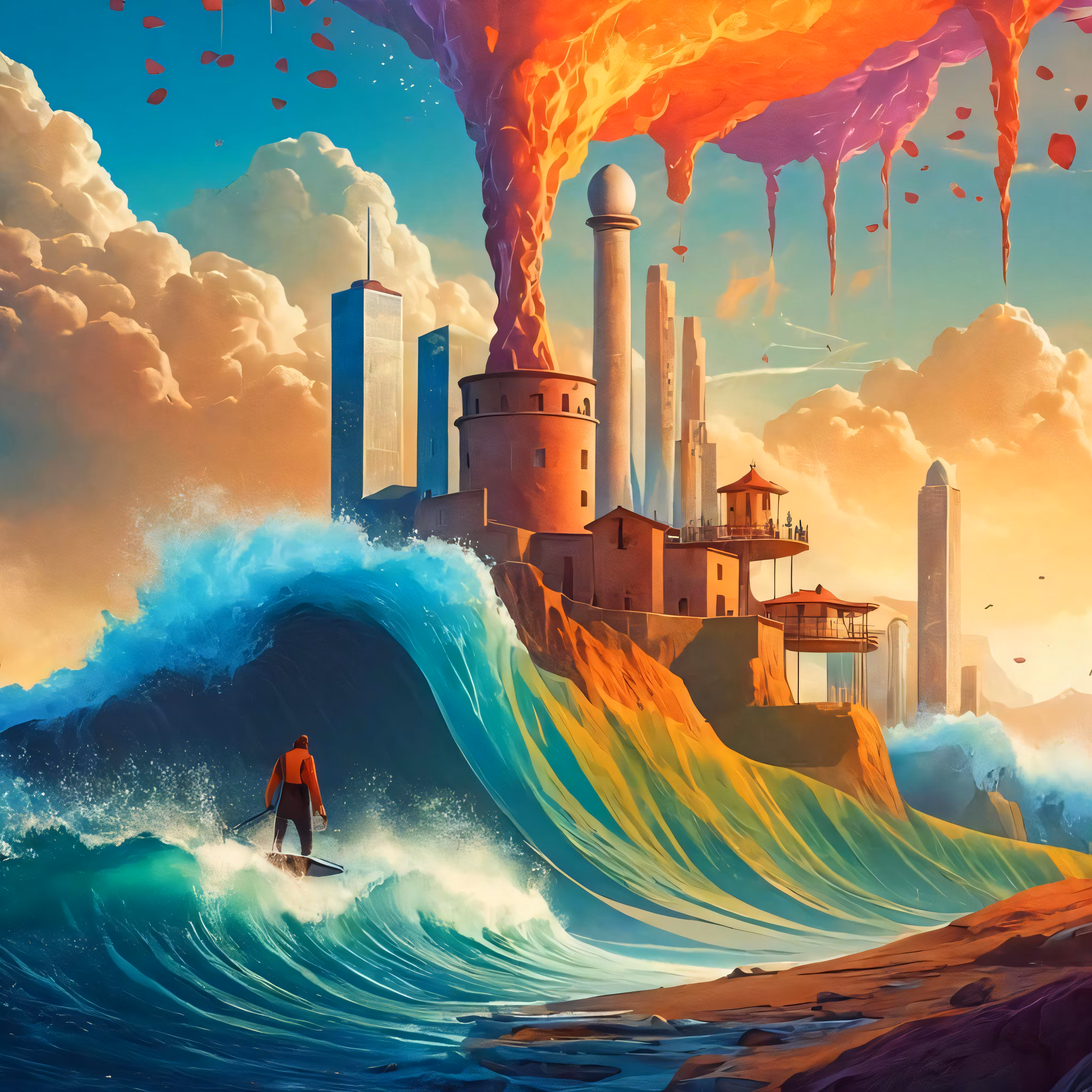 High resolution picture, free to use, a surreal painting with the ocean and the sky and mountains