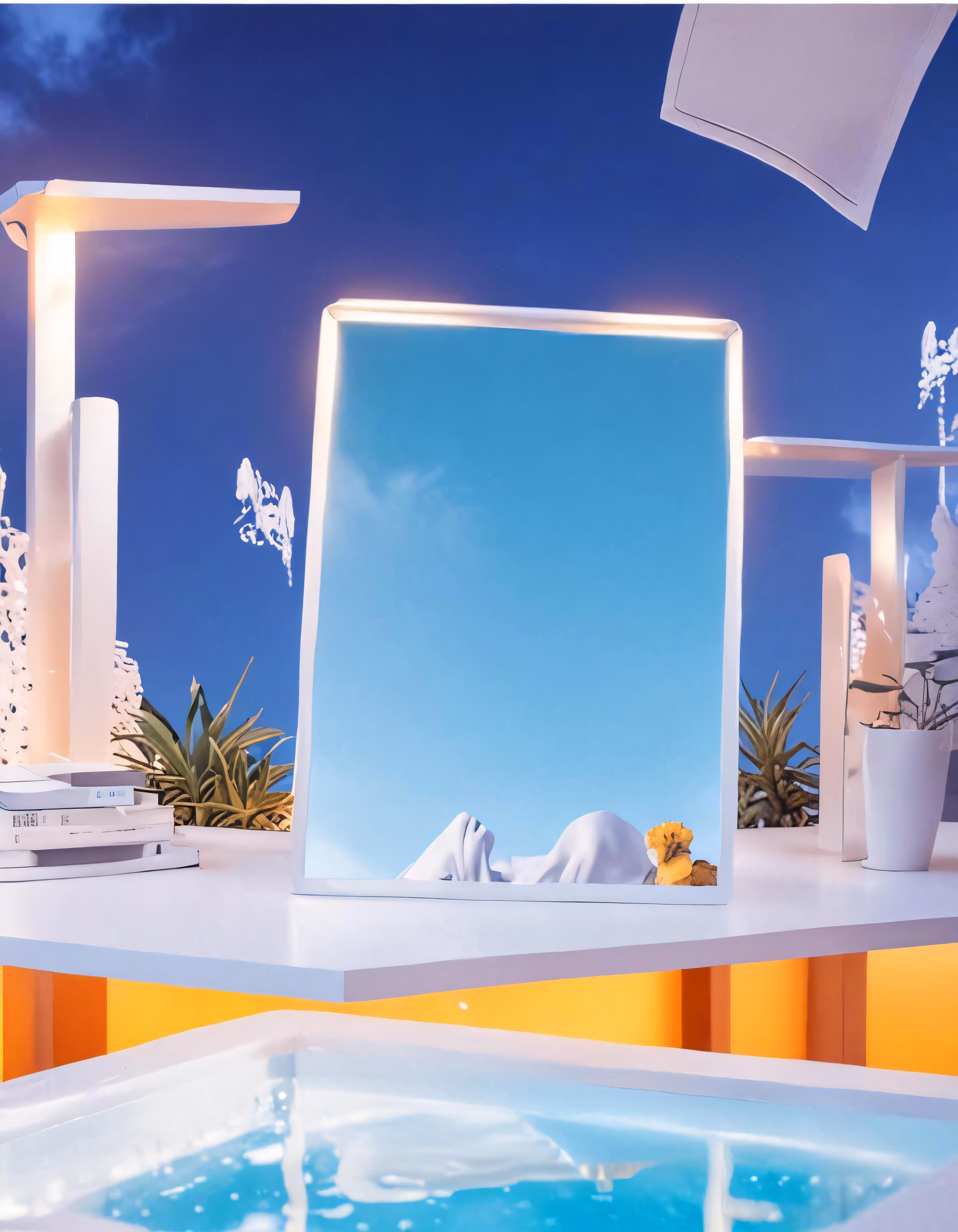 High resolution picture, free to use, a table with a plant and some pictures on it