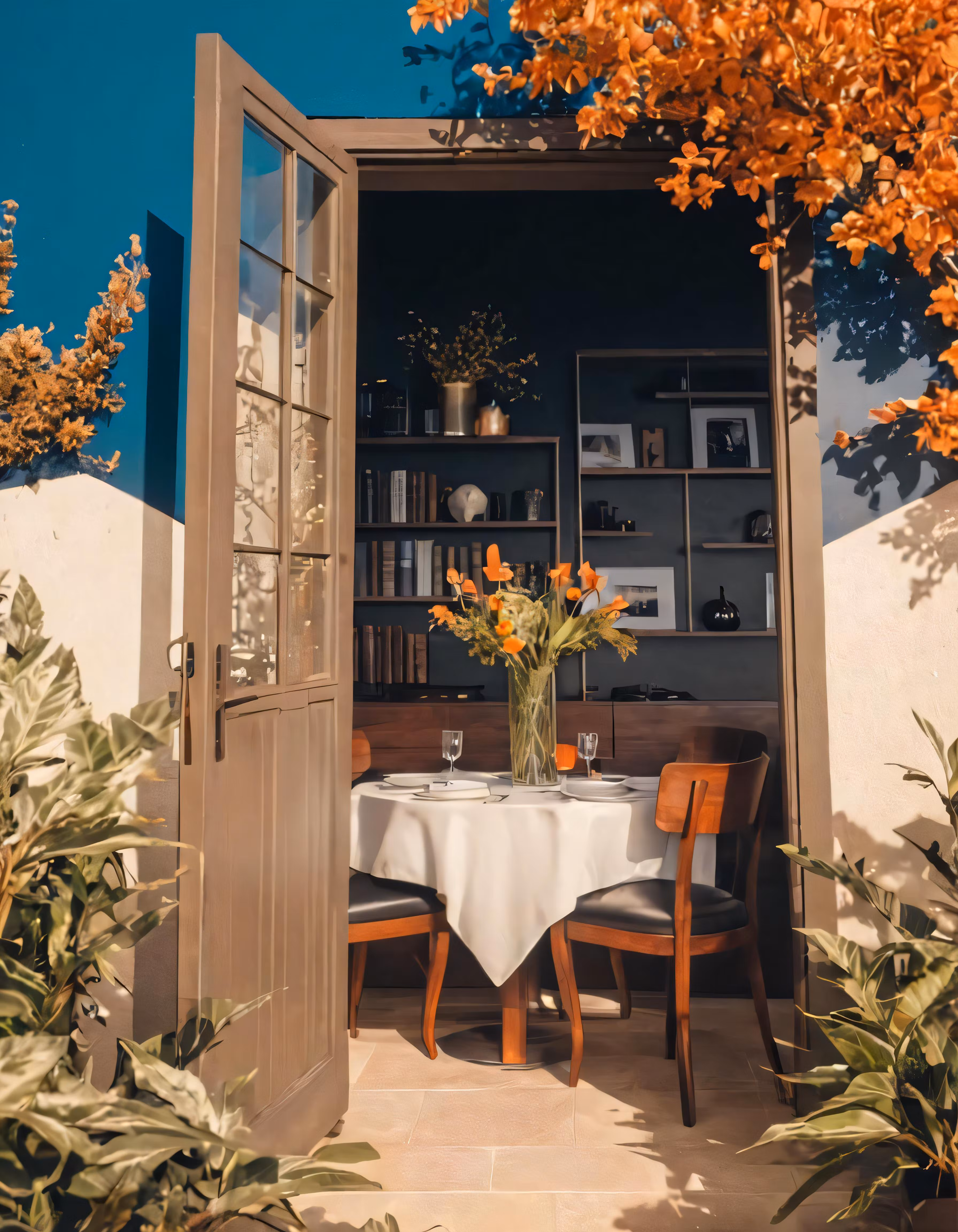High resolution picture, free to use, a table with a vase on it sitting under an open door