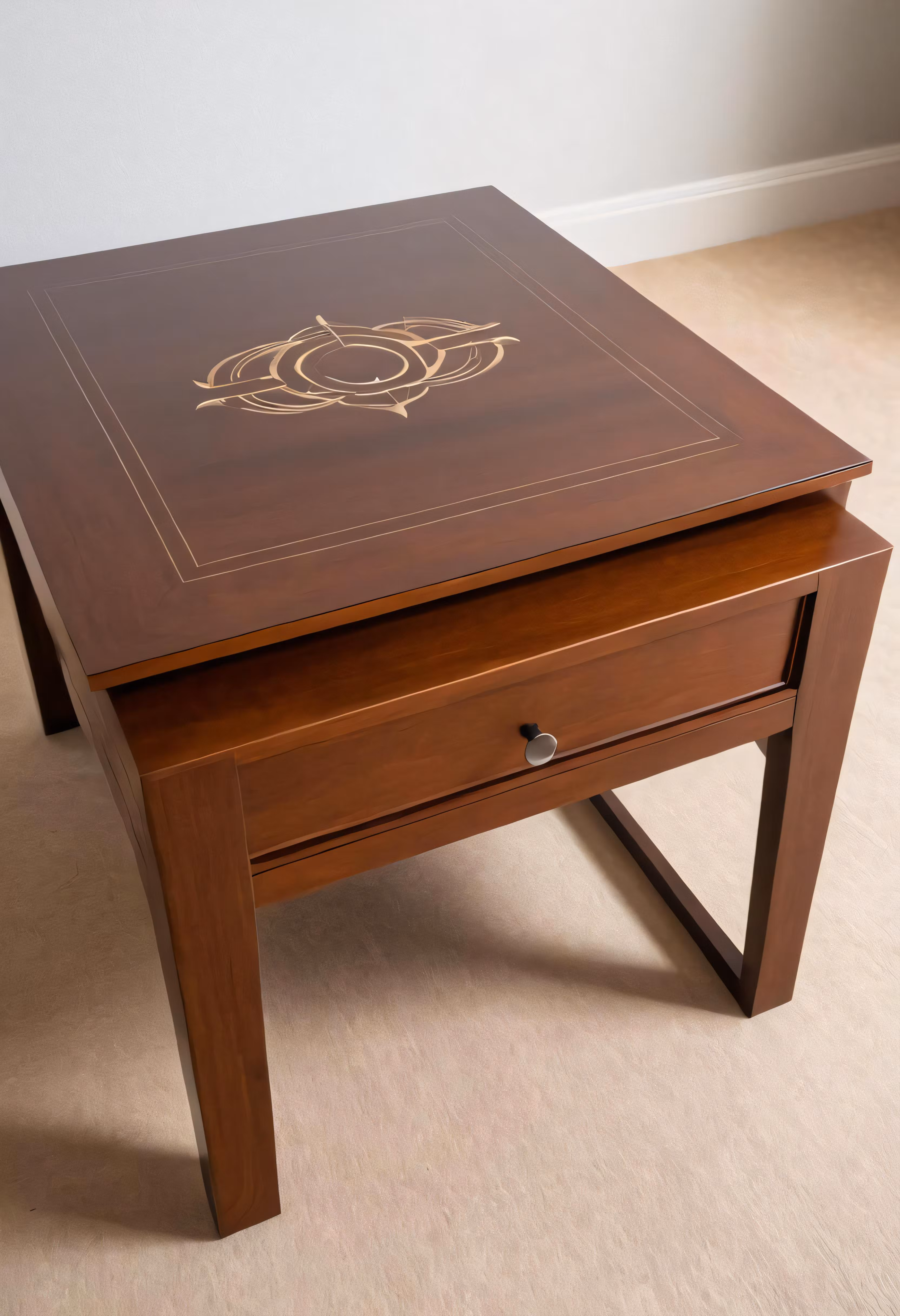 High resolution picture, free to use, a table with an artistic design and brown wood finish