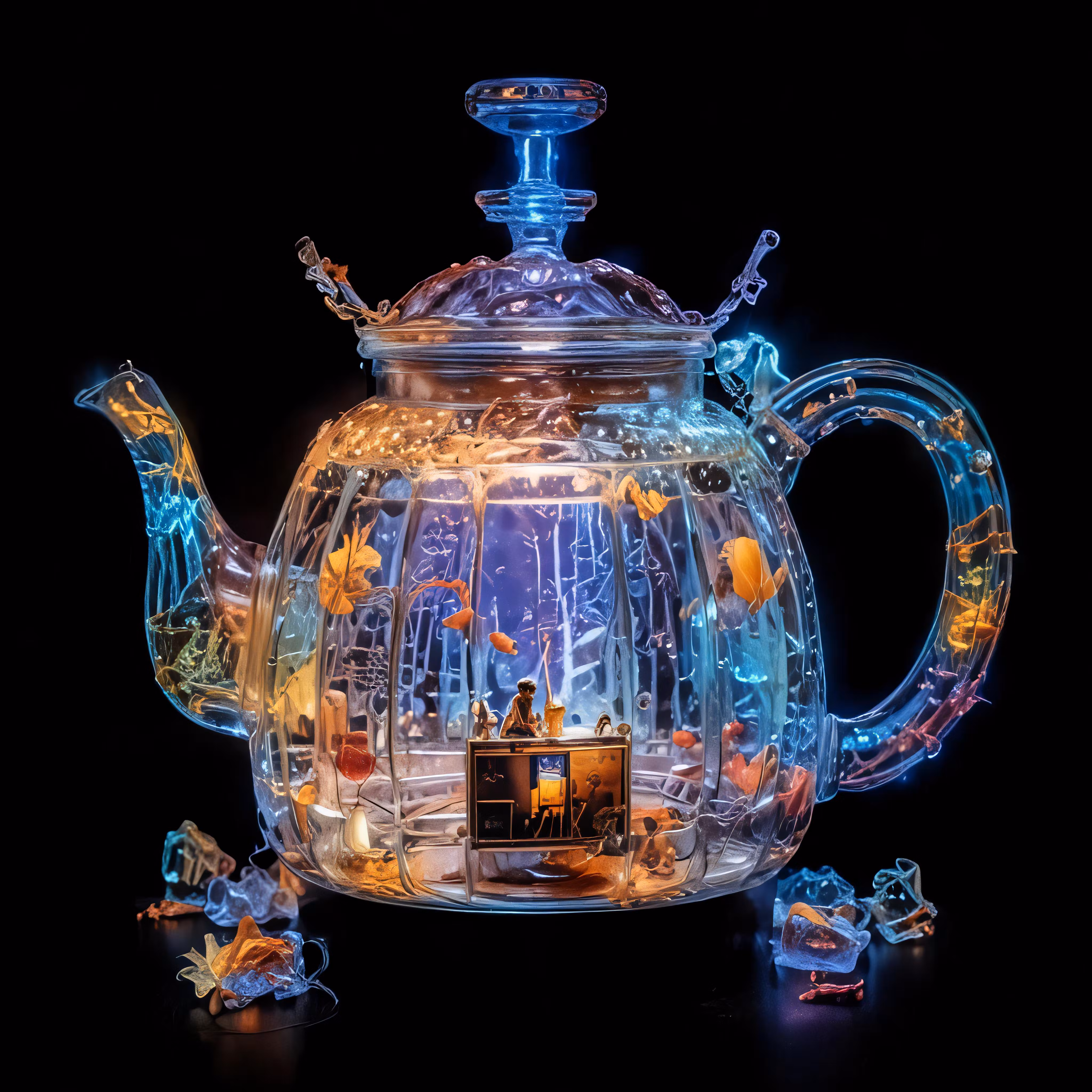 High resolution picture, free to use, a teapot filled with a photo and glass decorations