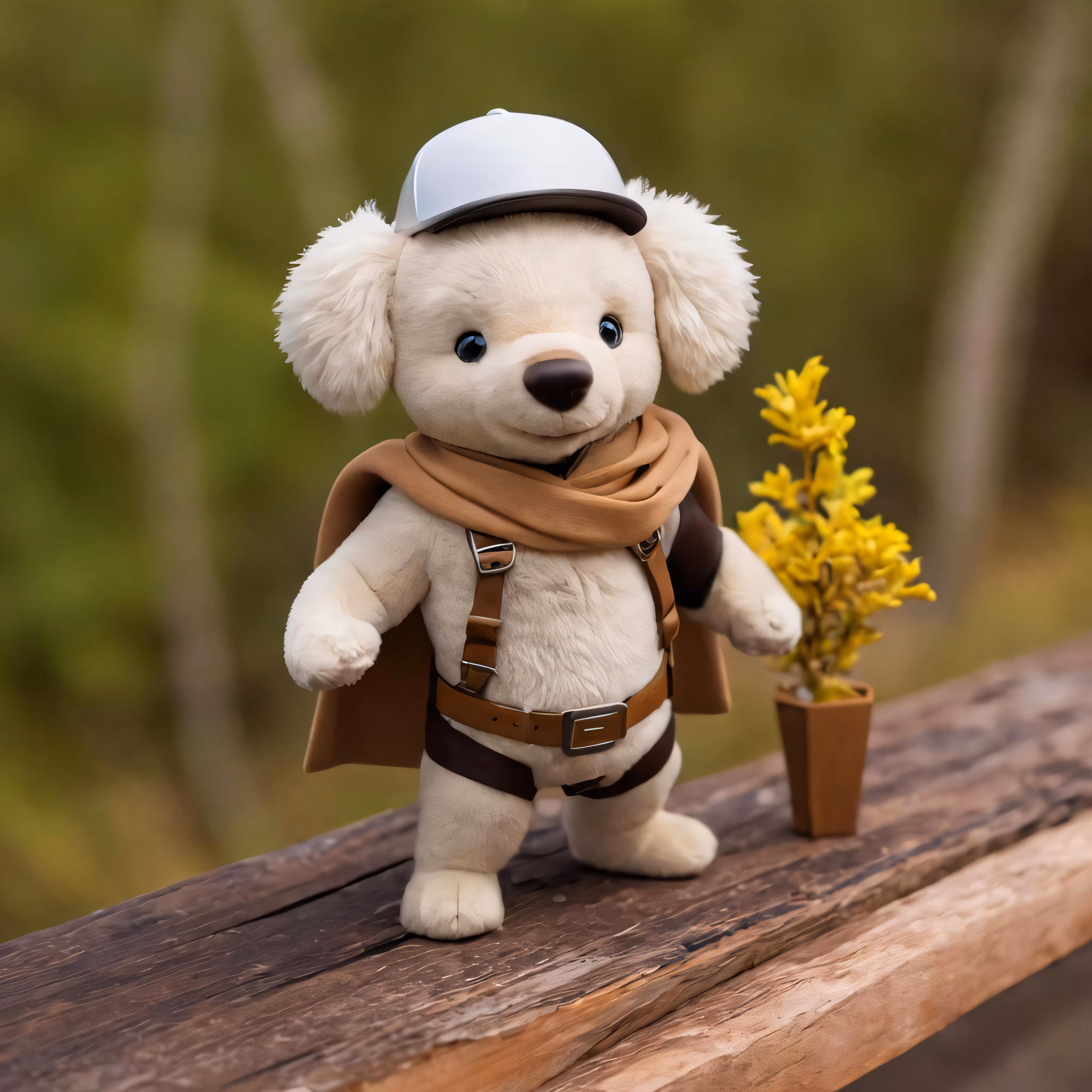 High resolution picture, free to use, a teddy bear with an outfit, hat, and scarf standing on a table next to a plant
