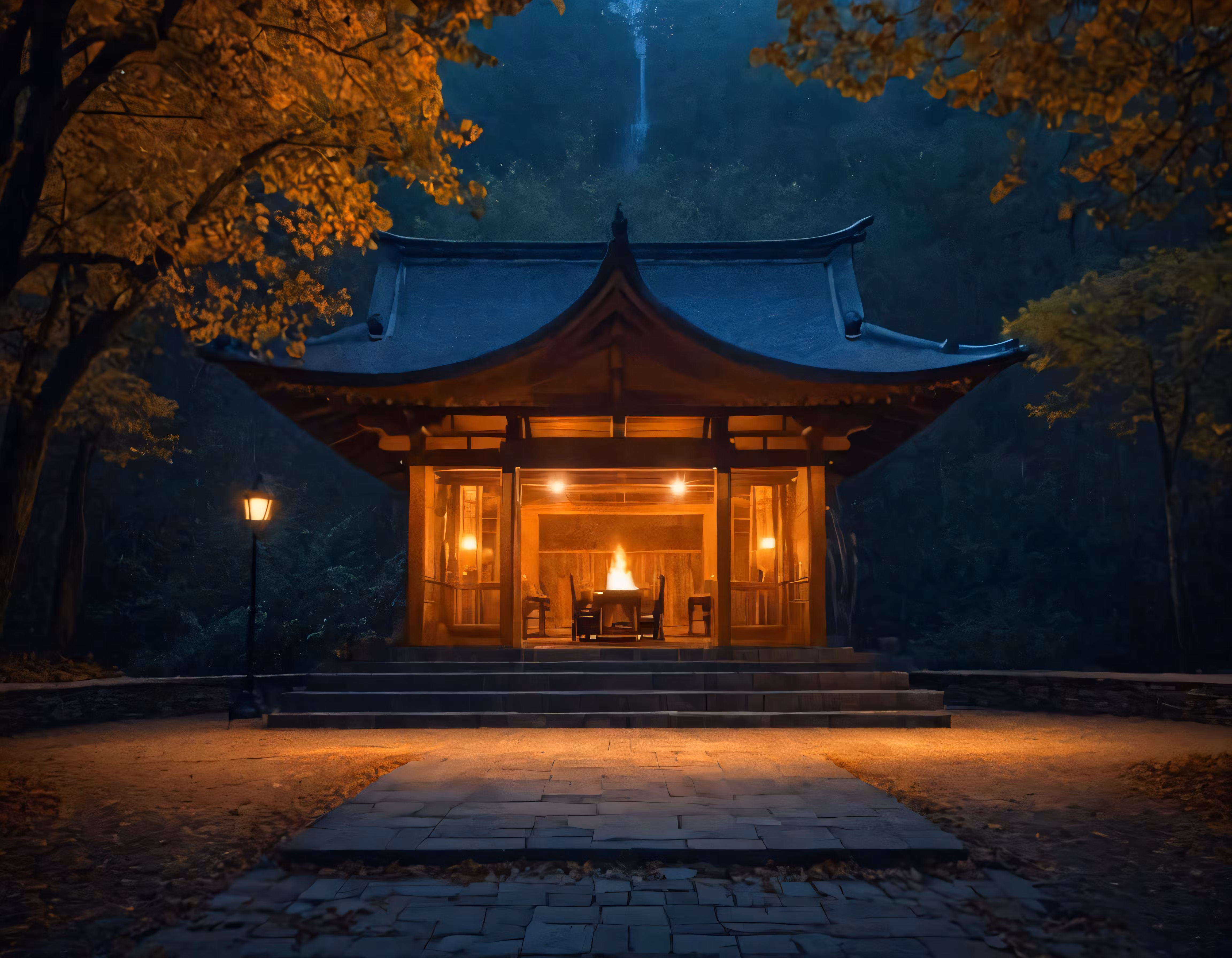 High resolution picture, free to use, a temple building lit up with lanterns at night