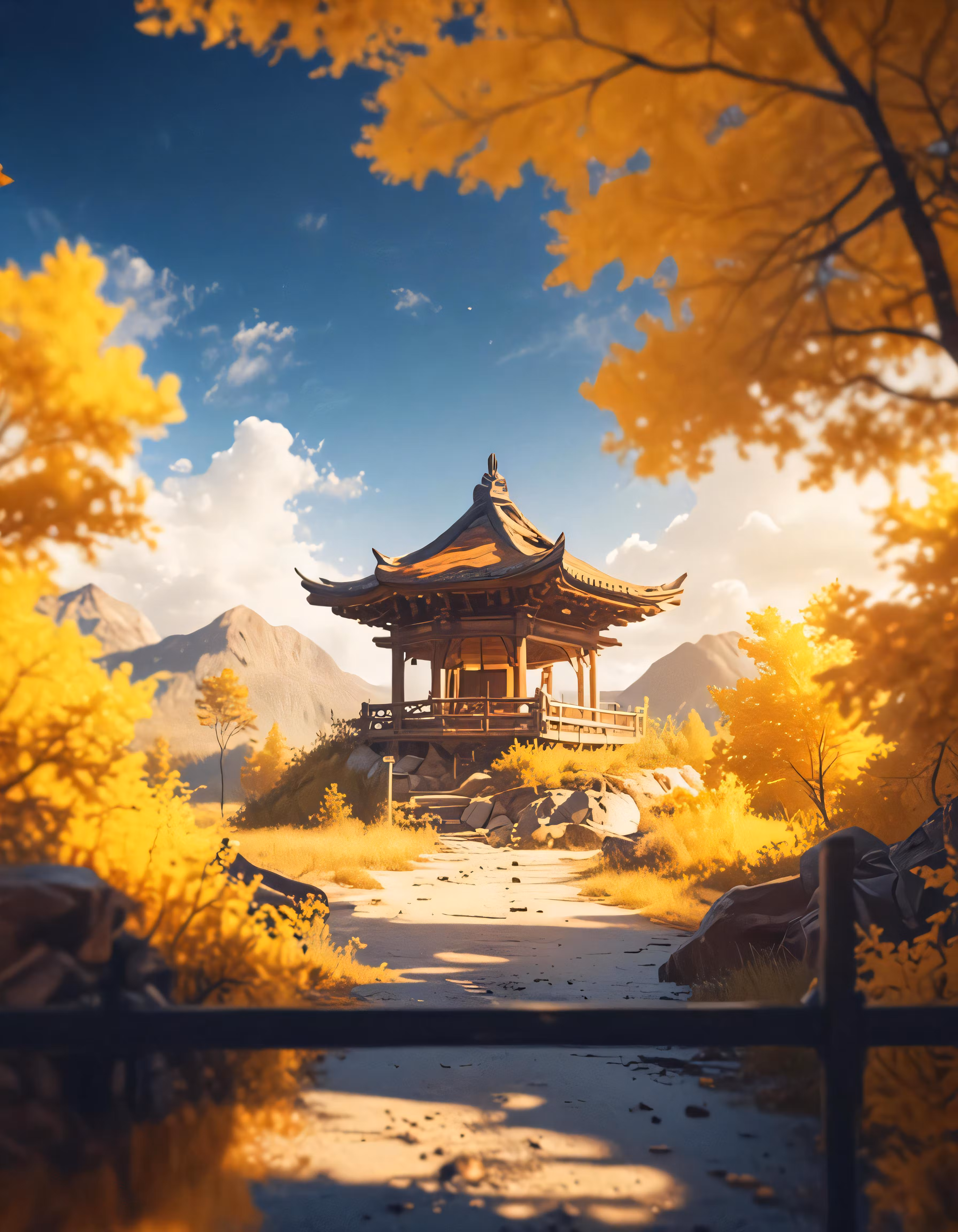 High resolution picture, free to use, a temple on a small island with golden leaves