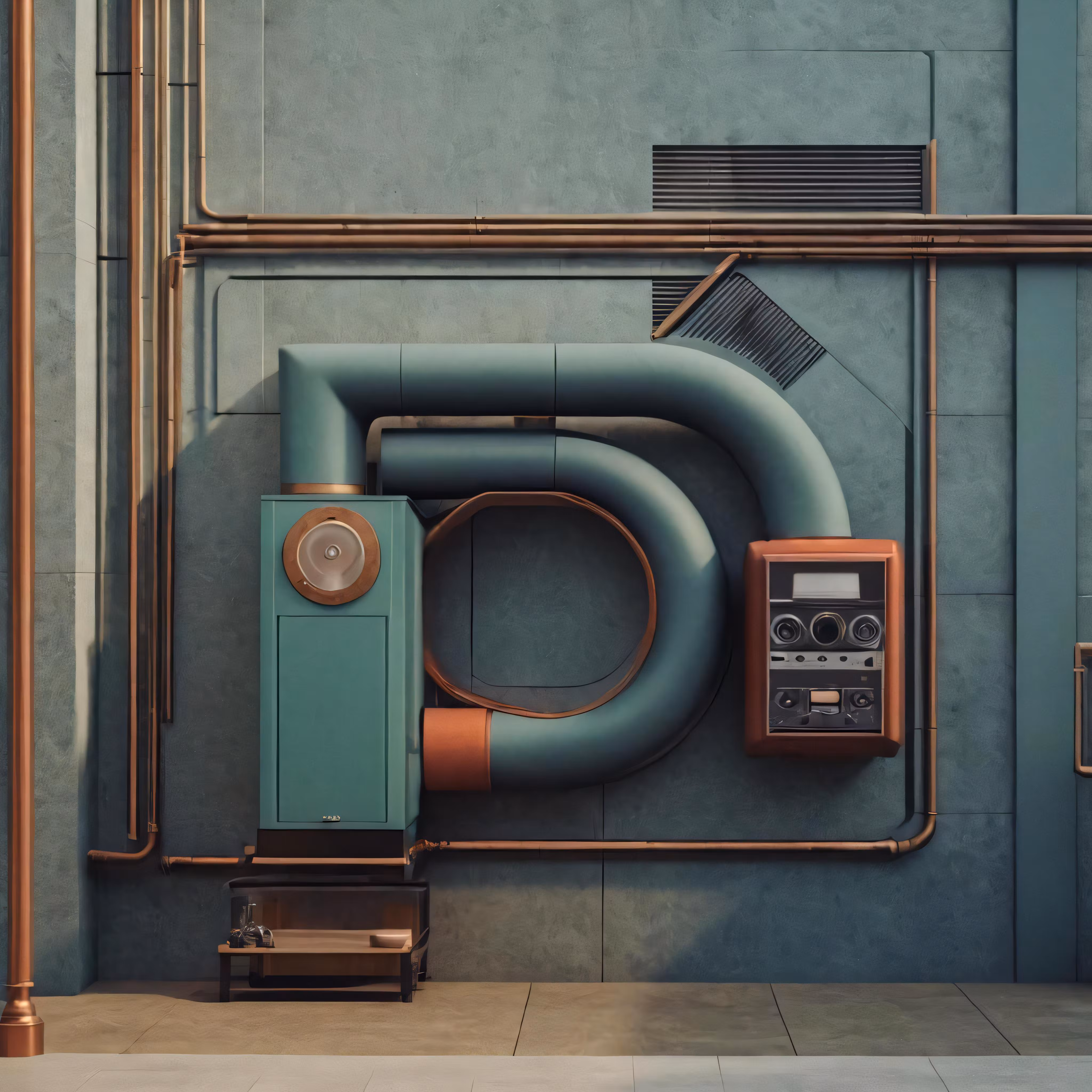 High resolution picture, free to use, a toilet with a blue design with copper piping next to it