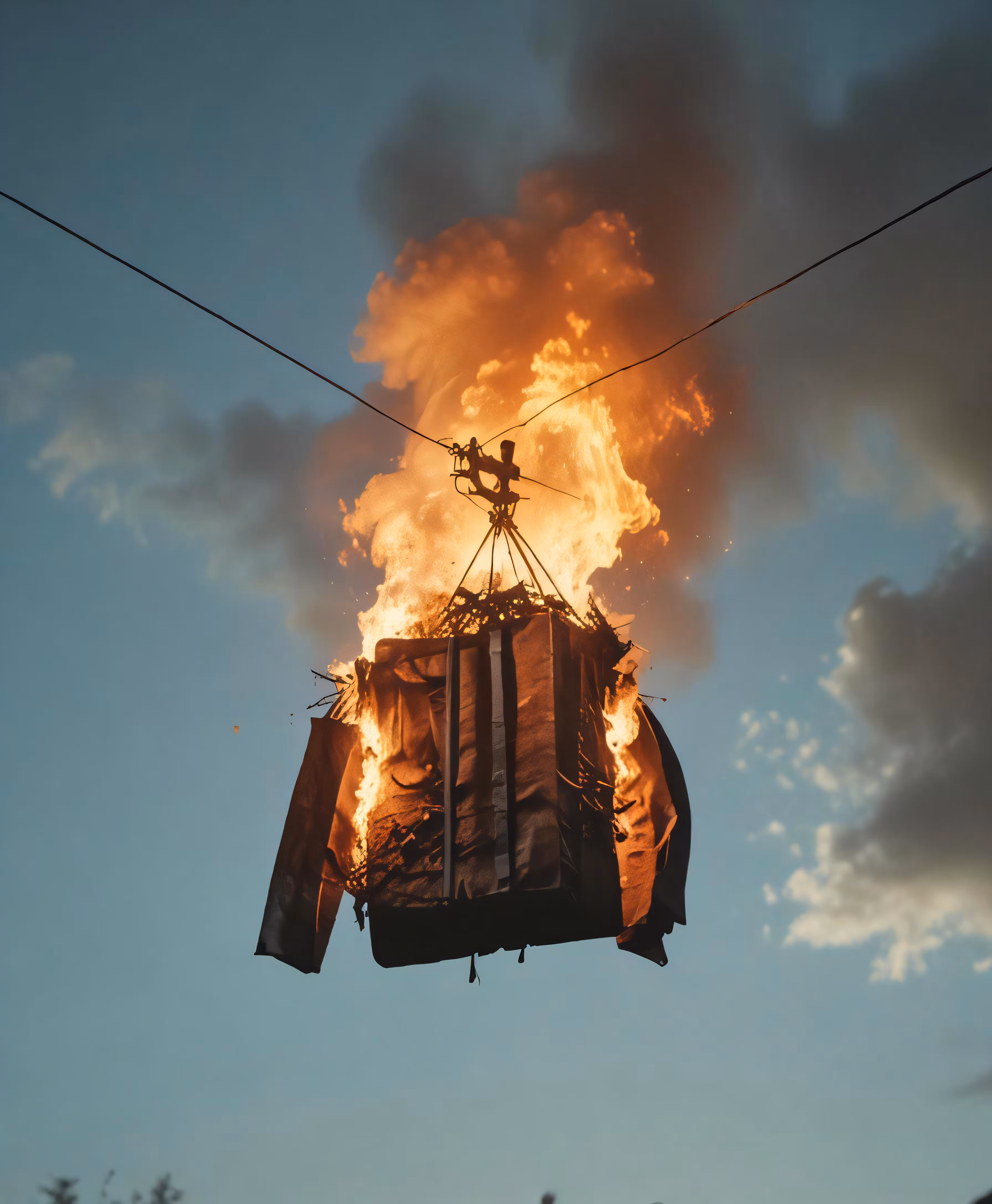 High resolution picture, free to use, a tower crane in the air with flames coming from it