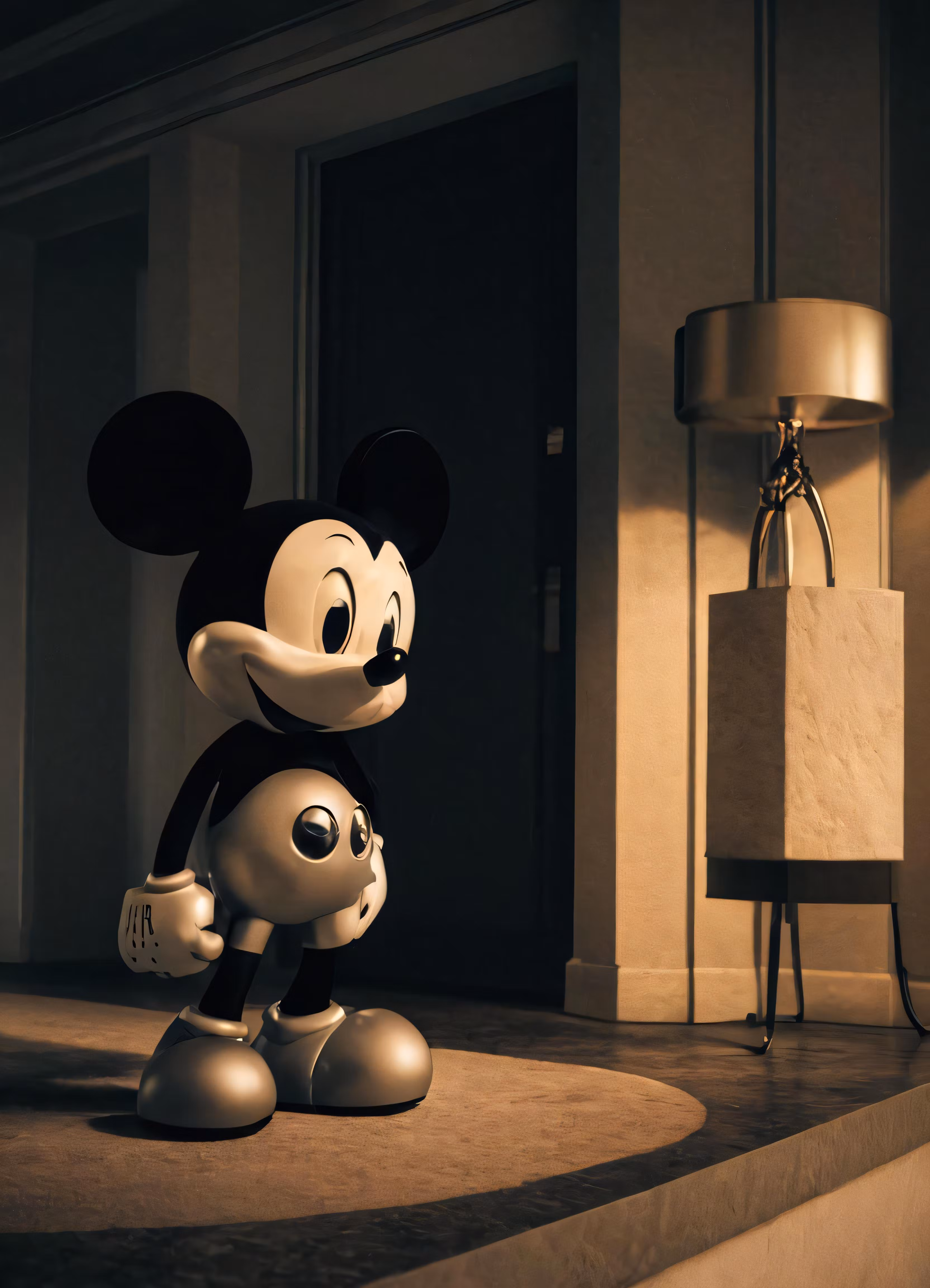 High resolution picture, free to use, a toy mickey mouse stands on the step near a lamp