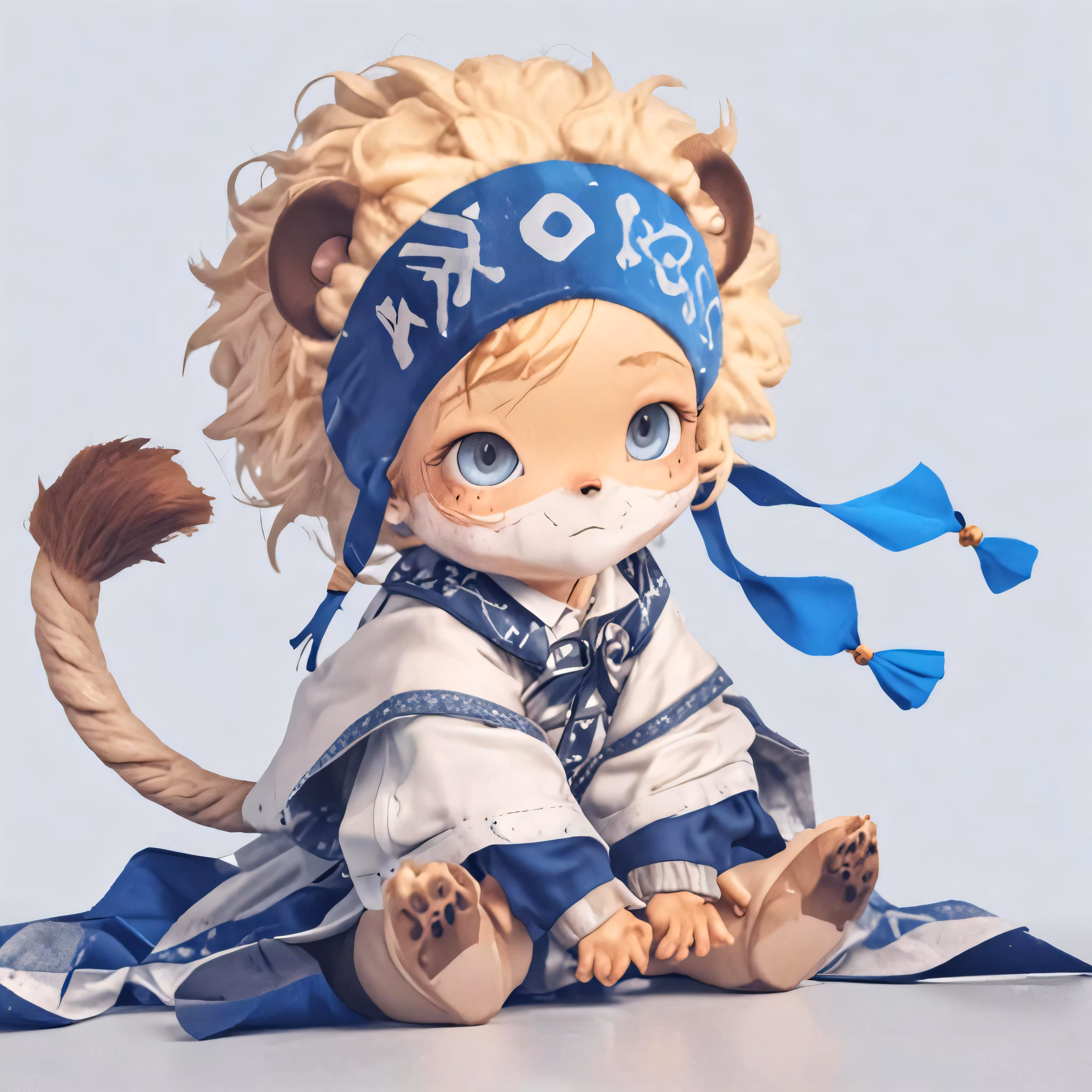 High resolution picture, free to use, a toy wearing blue clothing sitting on top of a table