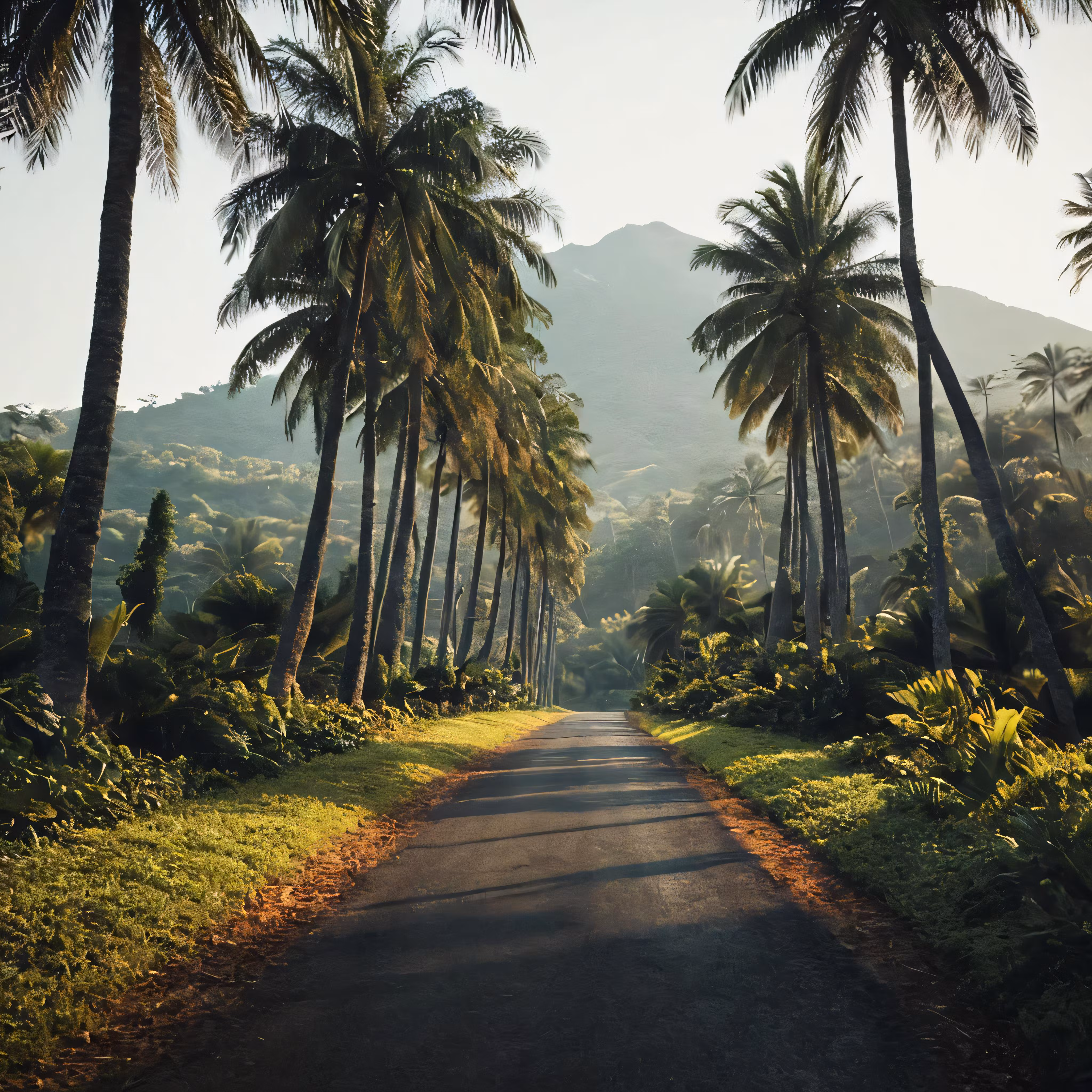 High resolution picture, free to use, a tropical palm tree lined road with a mountain in the background