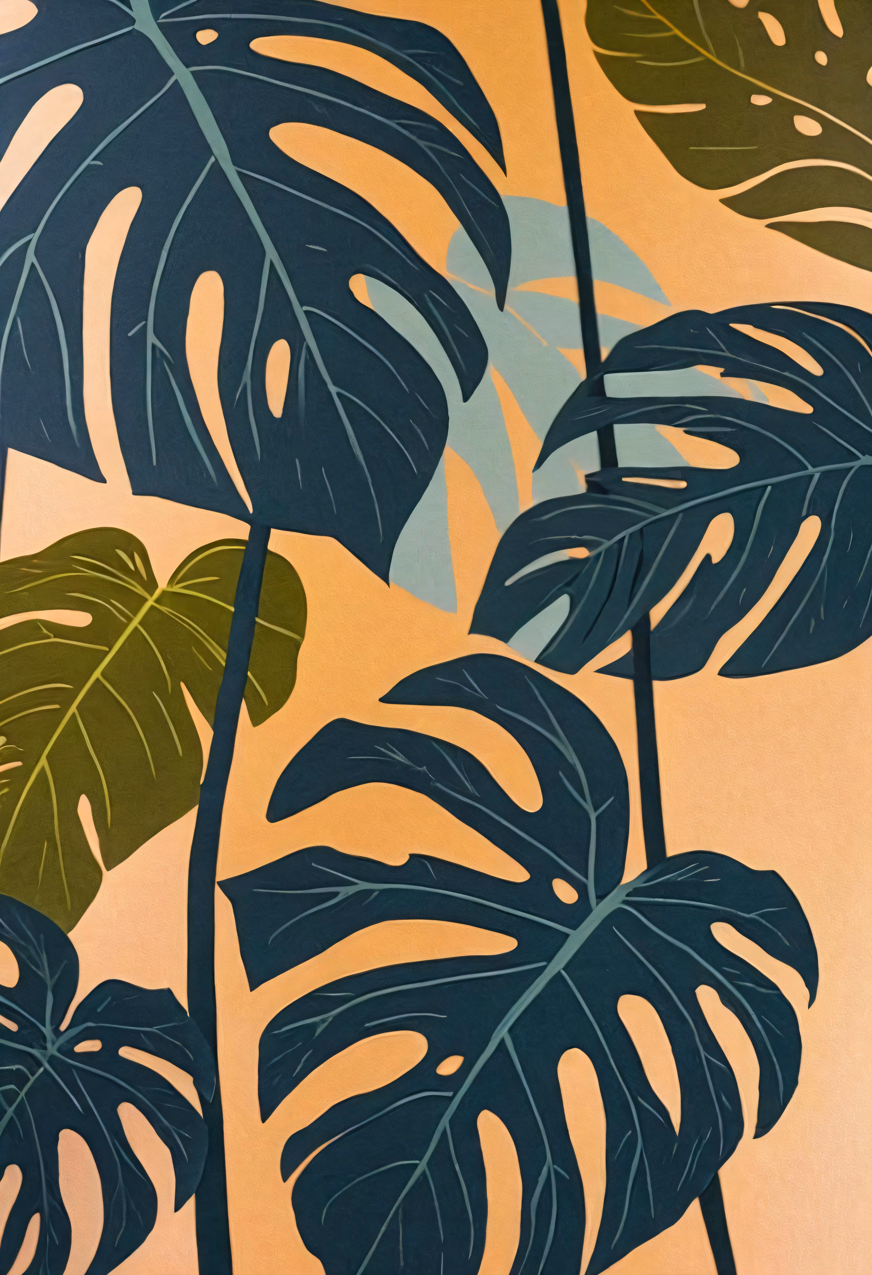 High resolution picture, free to use, a tropical themed mural with leaves and foliage