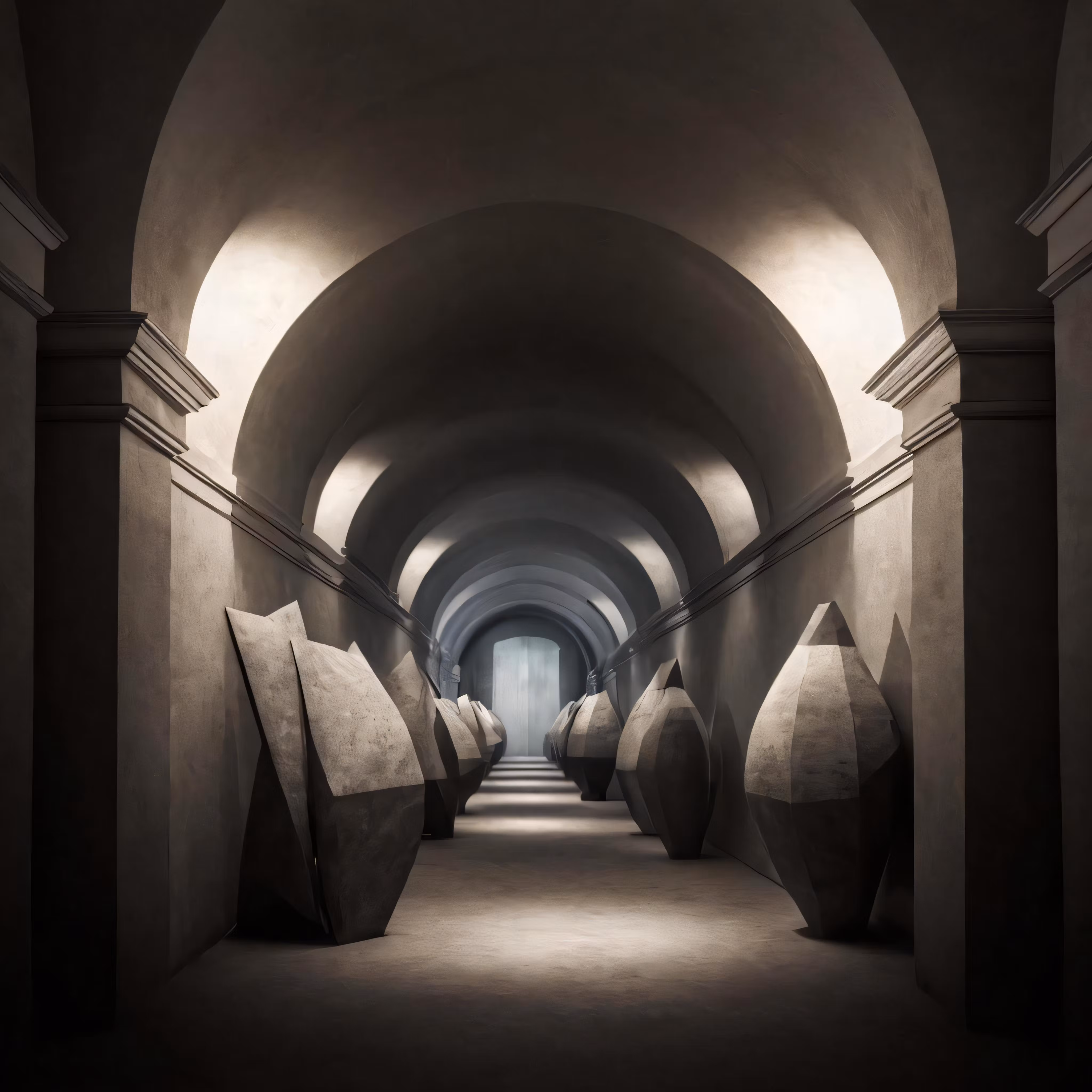 High resolution picture, free to use, a tunnel way with three large round vases lined up and empty