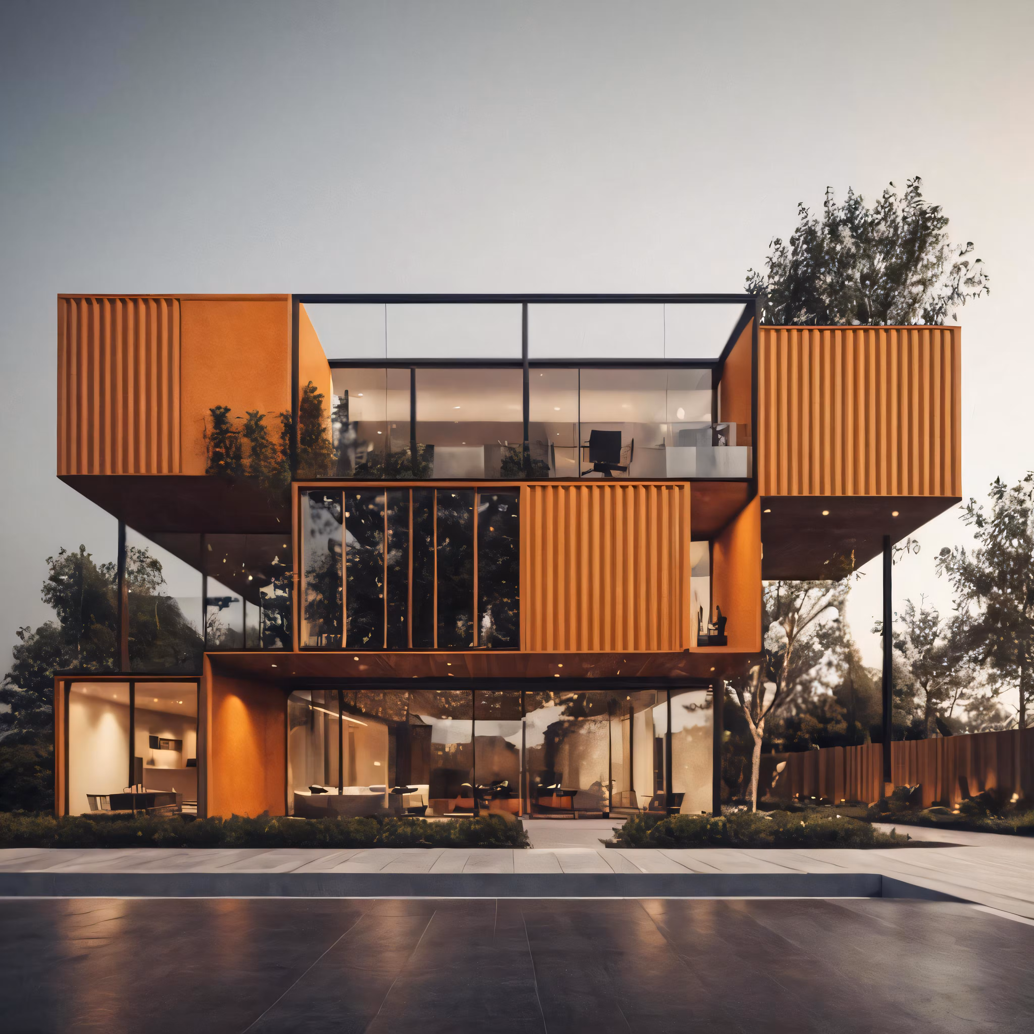 High resolution picture, free to use, a two story building with multiple balconies and large wooden walls