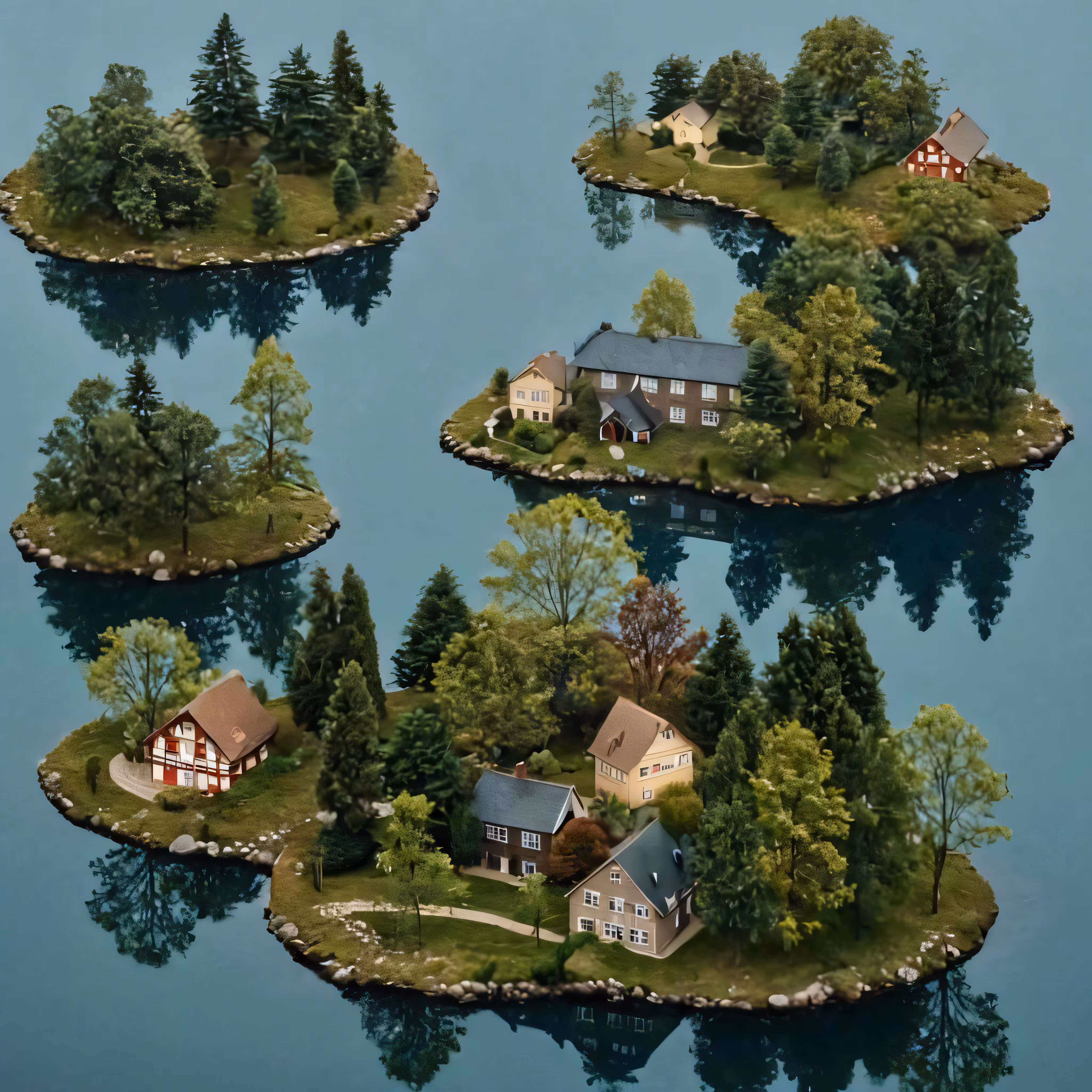 High resolution picture, free to use, a variety of tiny houses on island shaped in the water