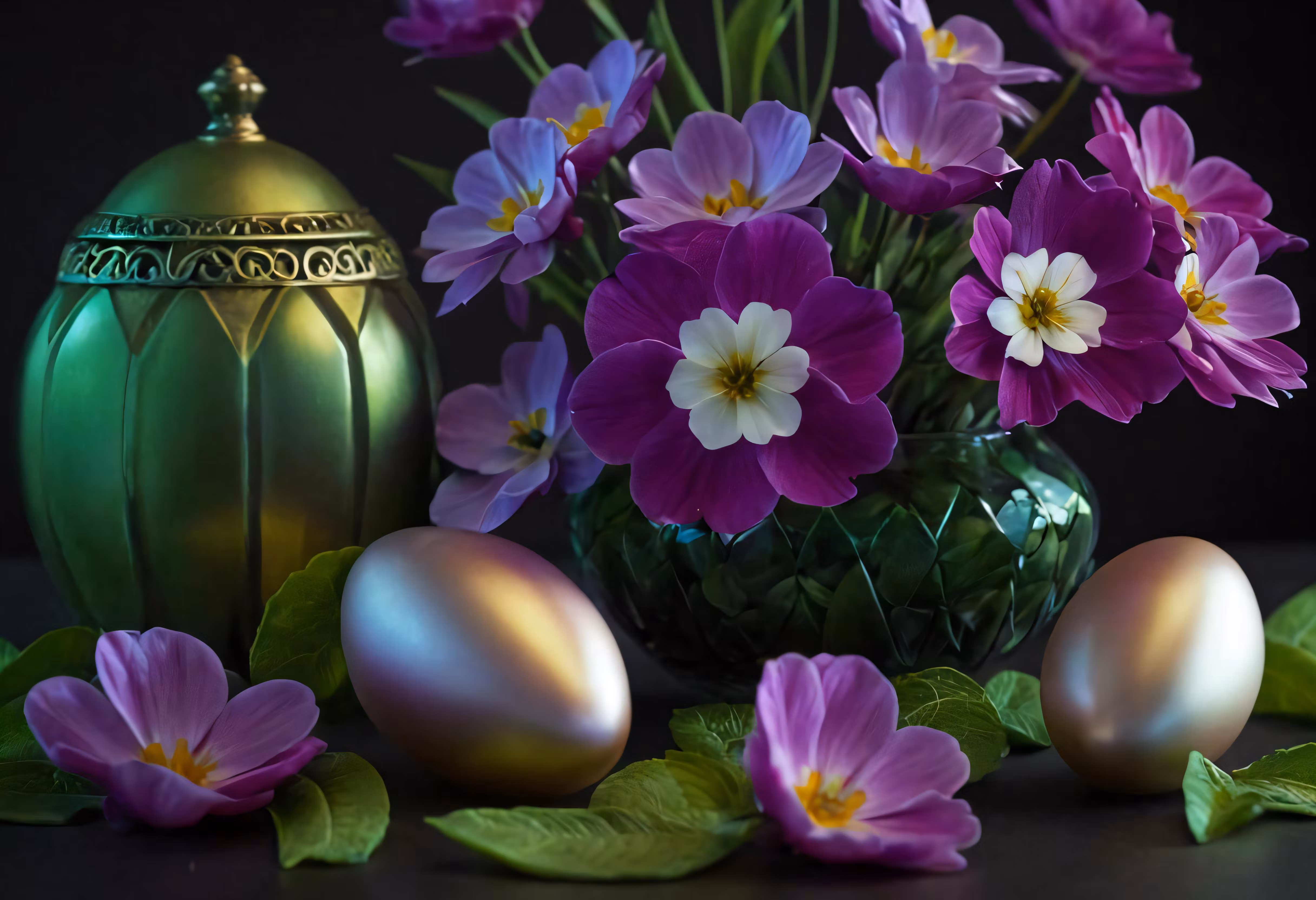 High resolution picture, free to use, a vase and flowers sit next to three smaller eggs