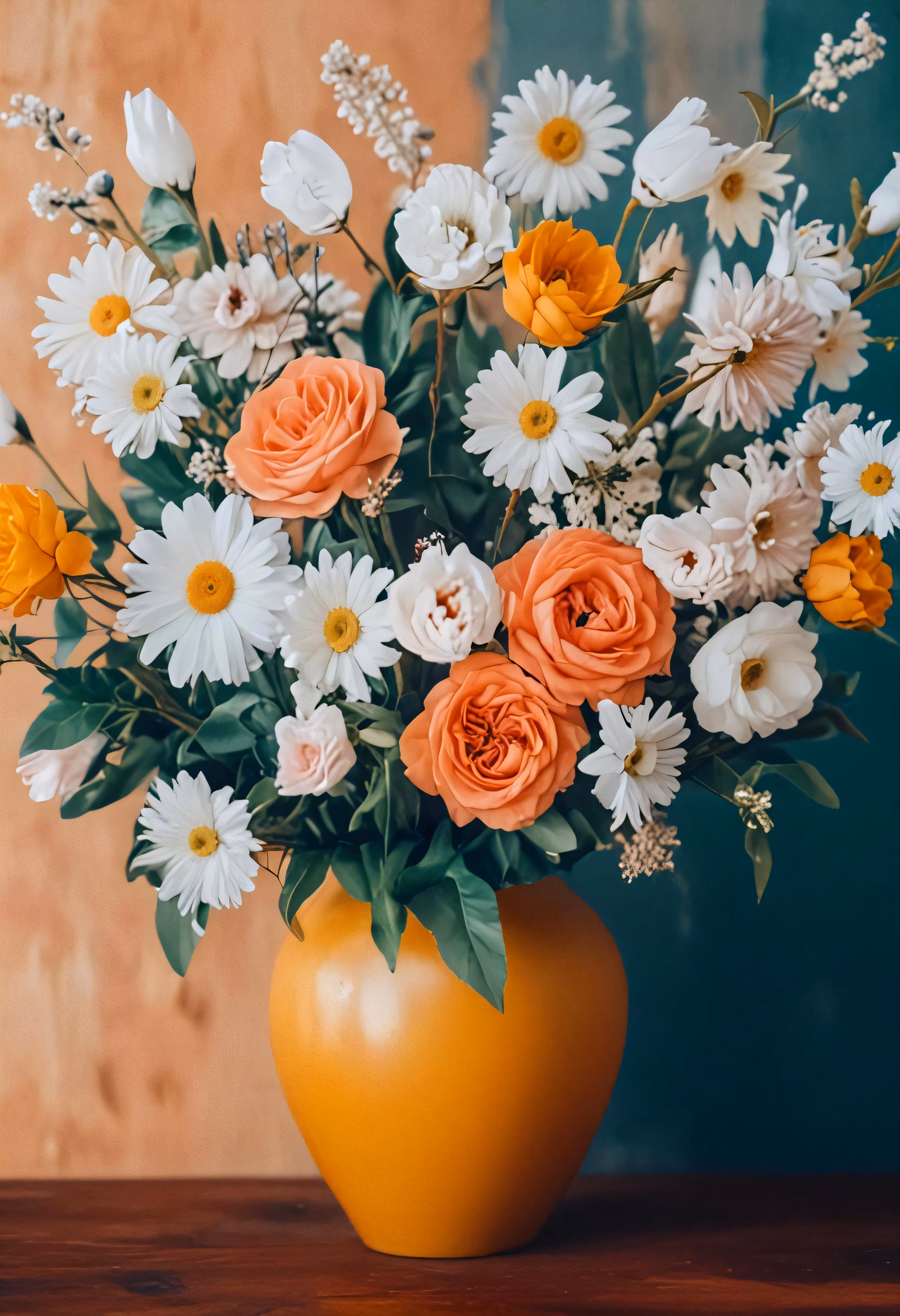 High resolution picture, free to use, a vase of daisies and flowers sits on a wooden surface