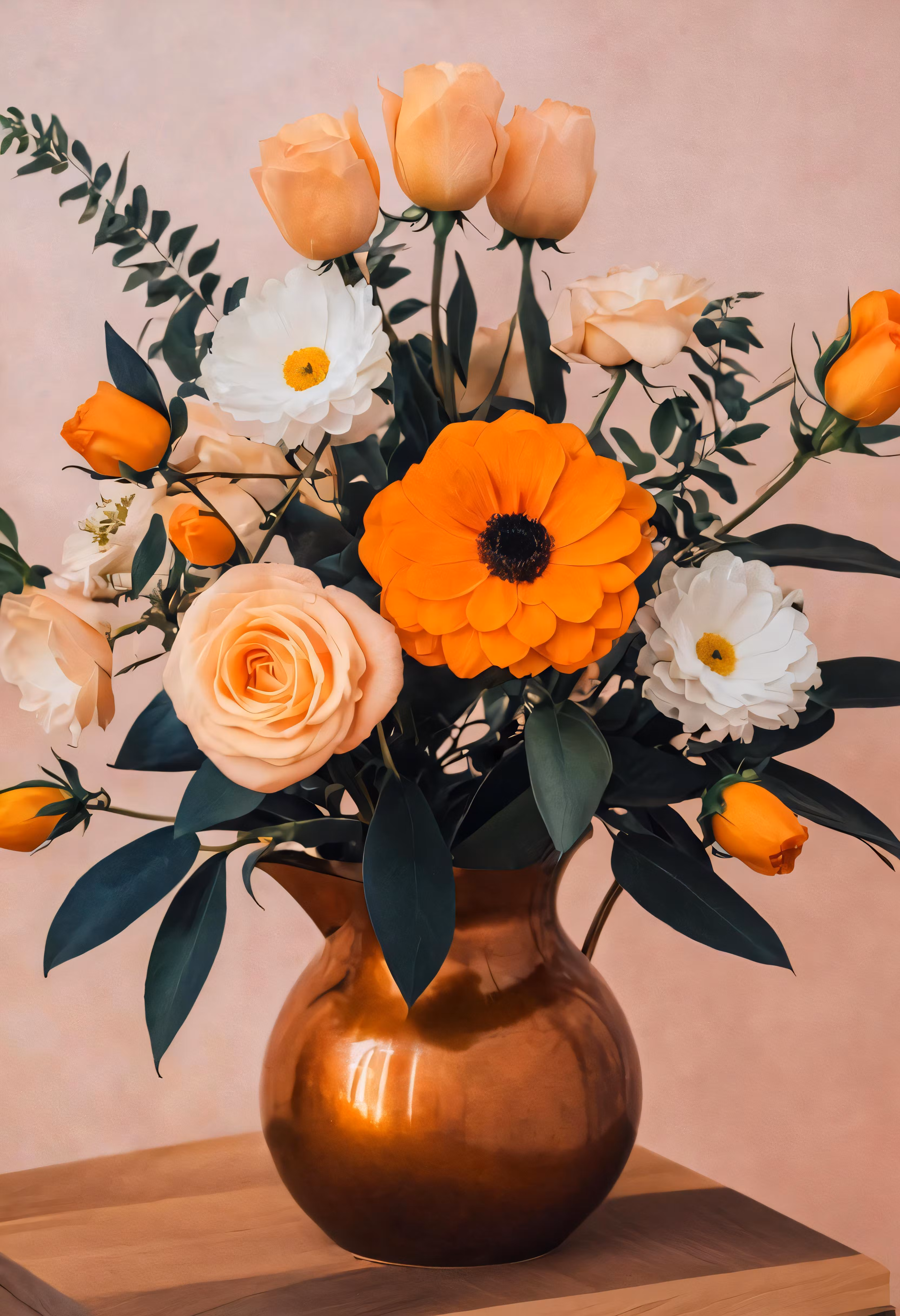 High resolution picture, free to use, a vase with yellow and white flowers is sitting on a table