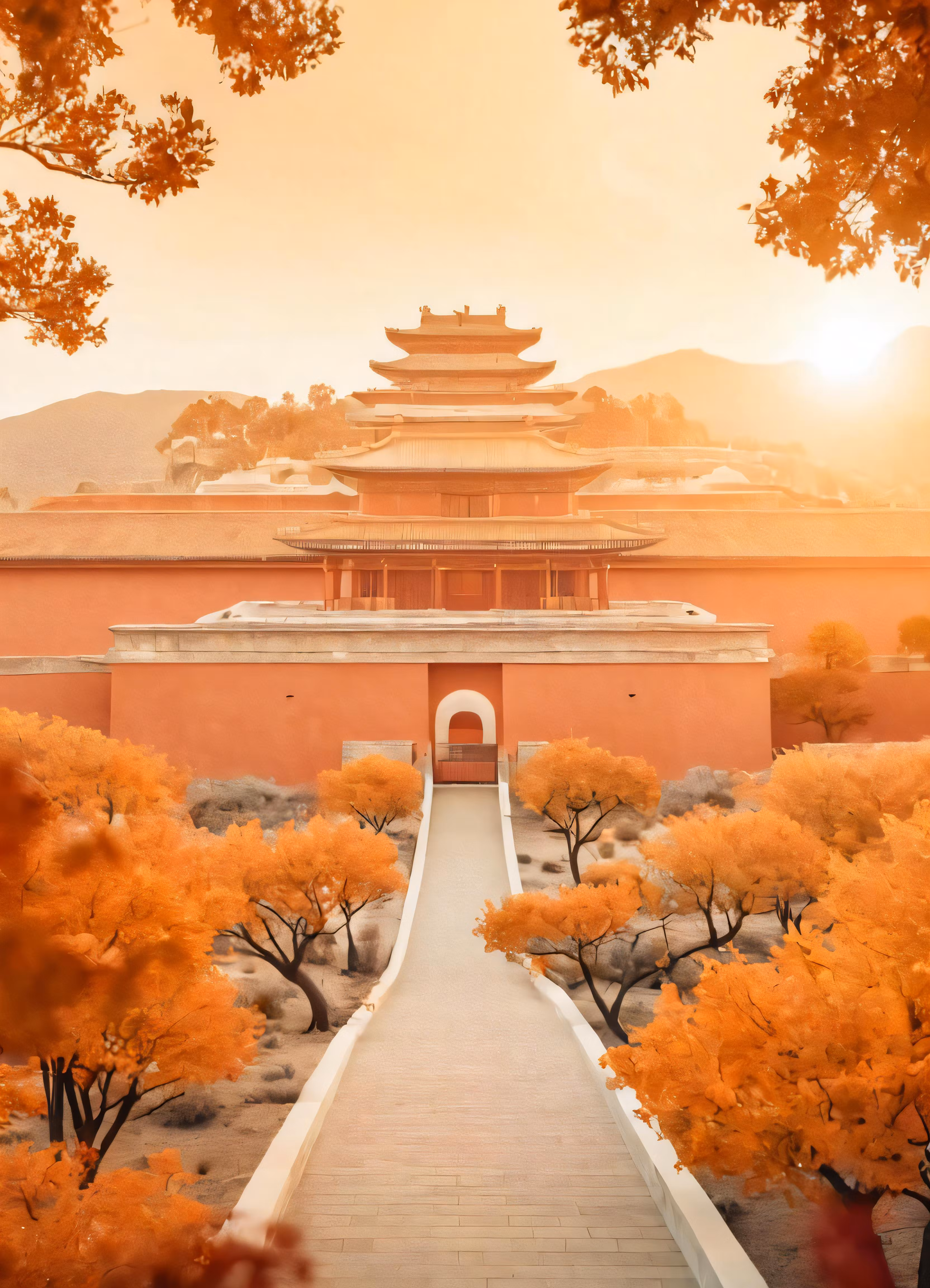 High resolution picture, free to use, a very beautiful scenery with orange trees and a long walkway