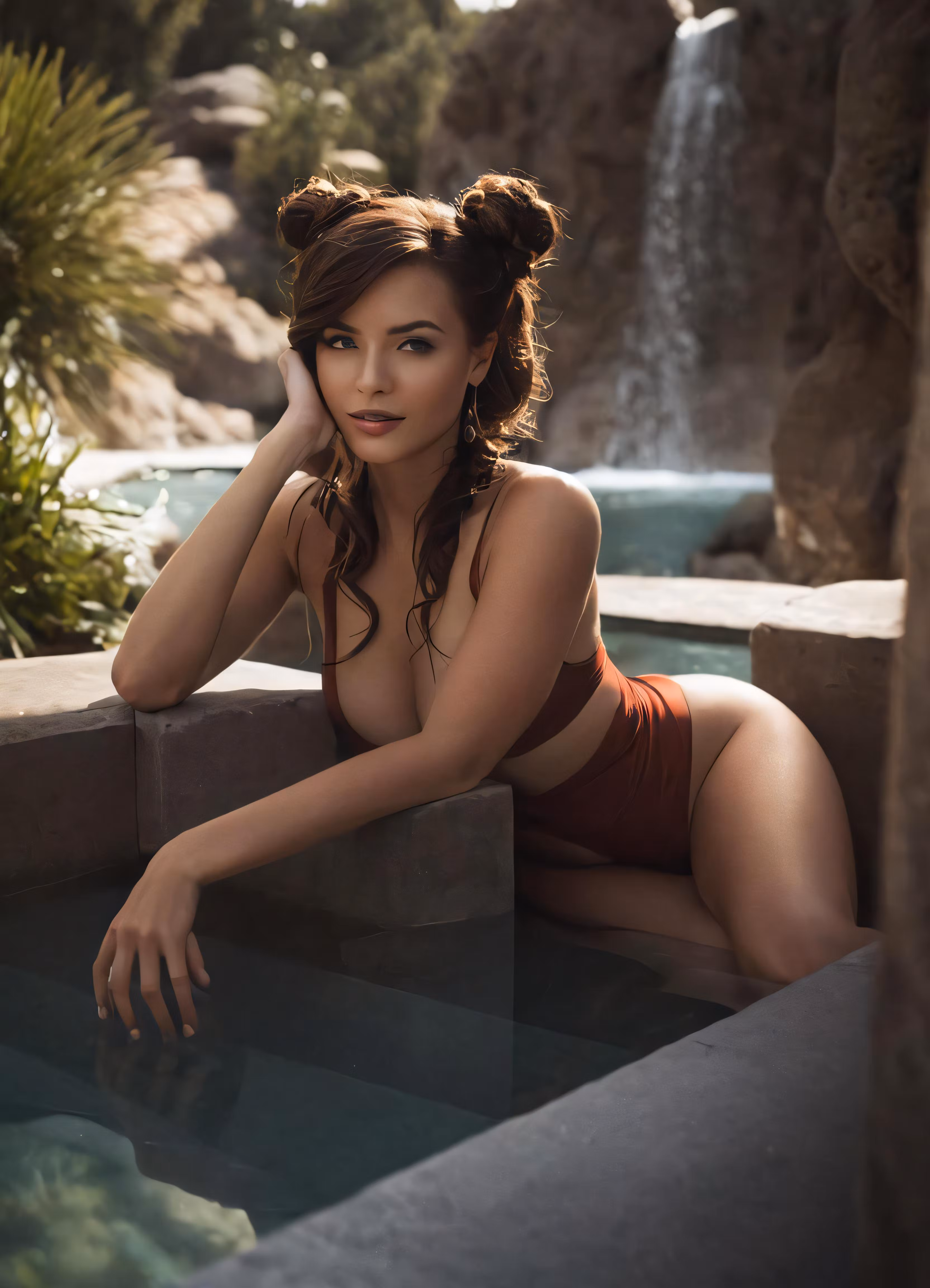 High resolution picture, free to use, a very beautiful woman sitting by a pool in front of a waterfall