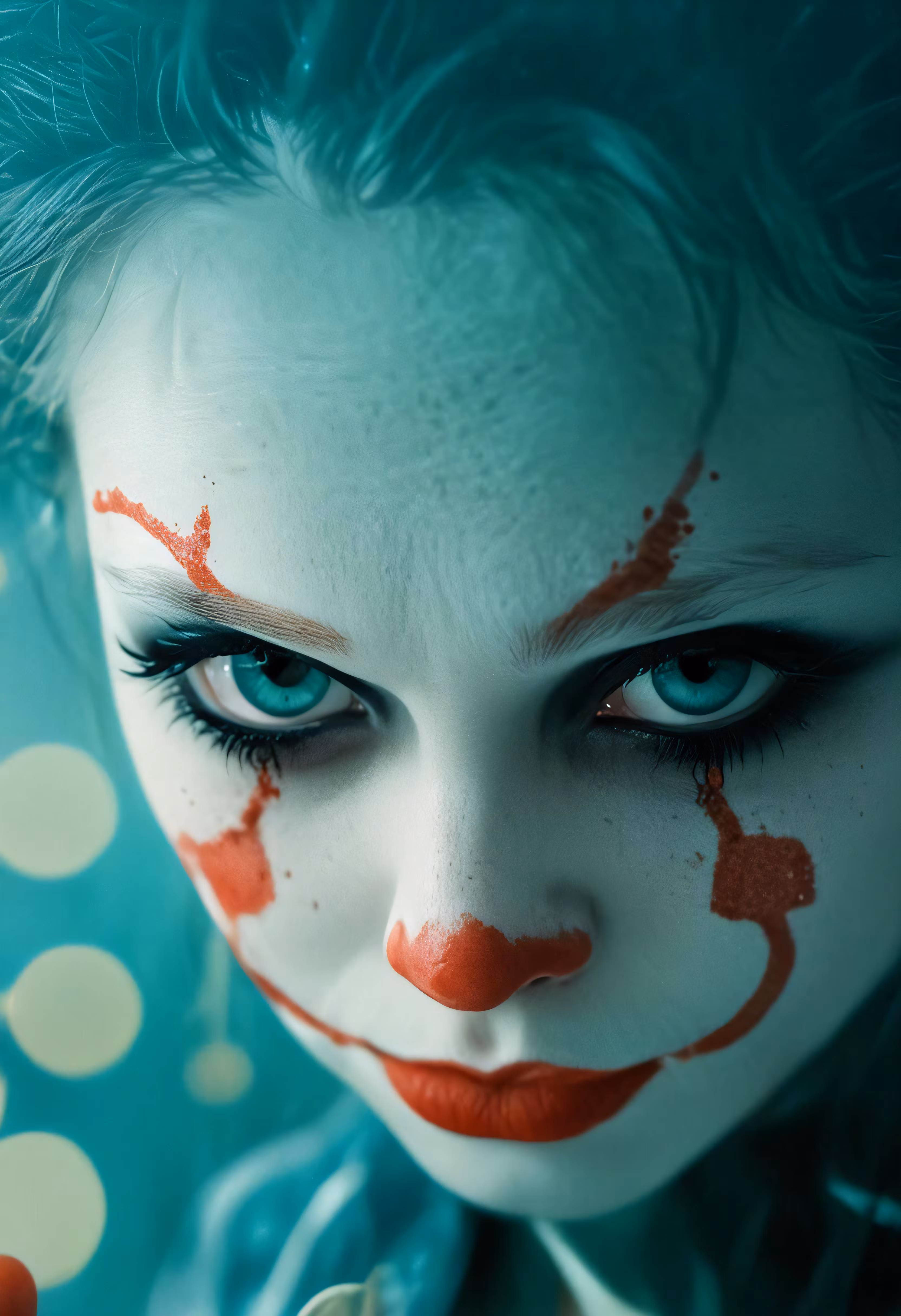 High resolution picture, free to use, a very creepy clown with white and orange painted on her face