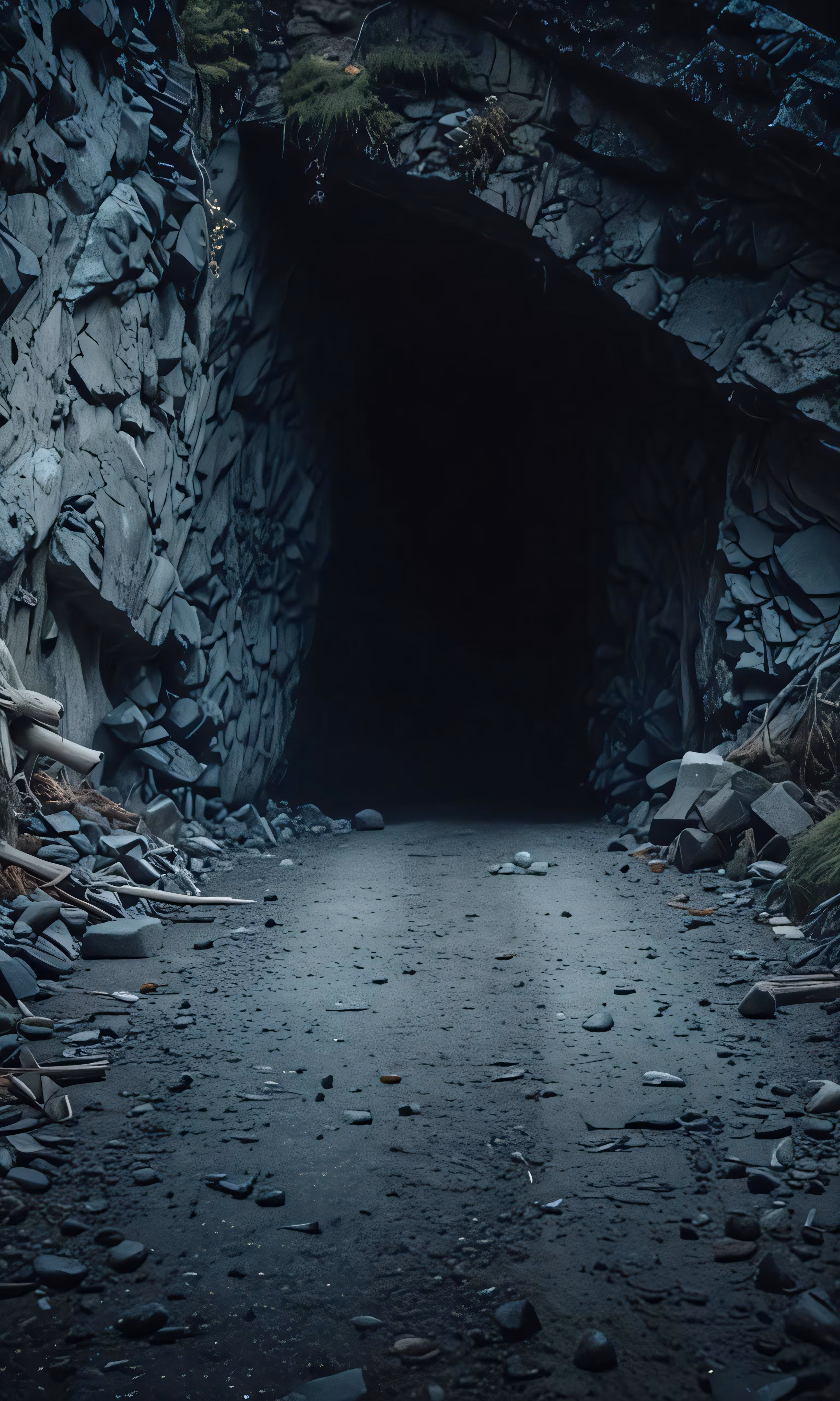 High resolution picture, free to use, a very dark and mysterious looking tunnel with some rocks