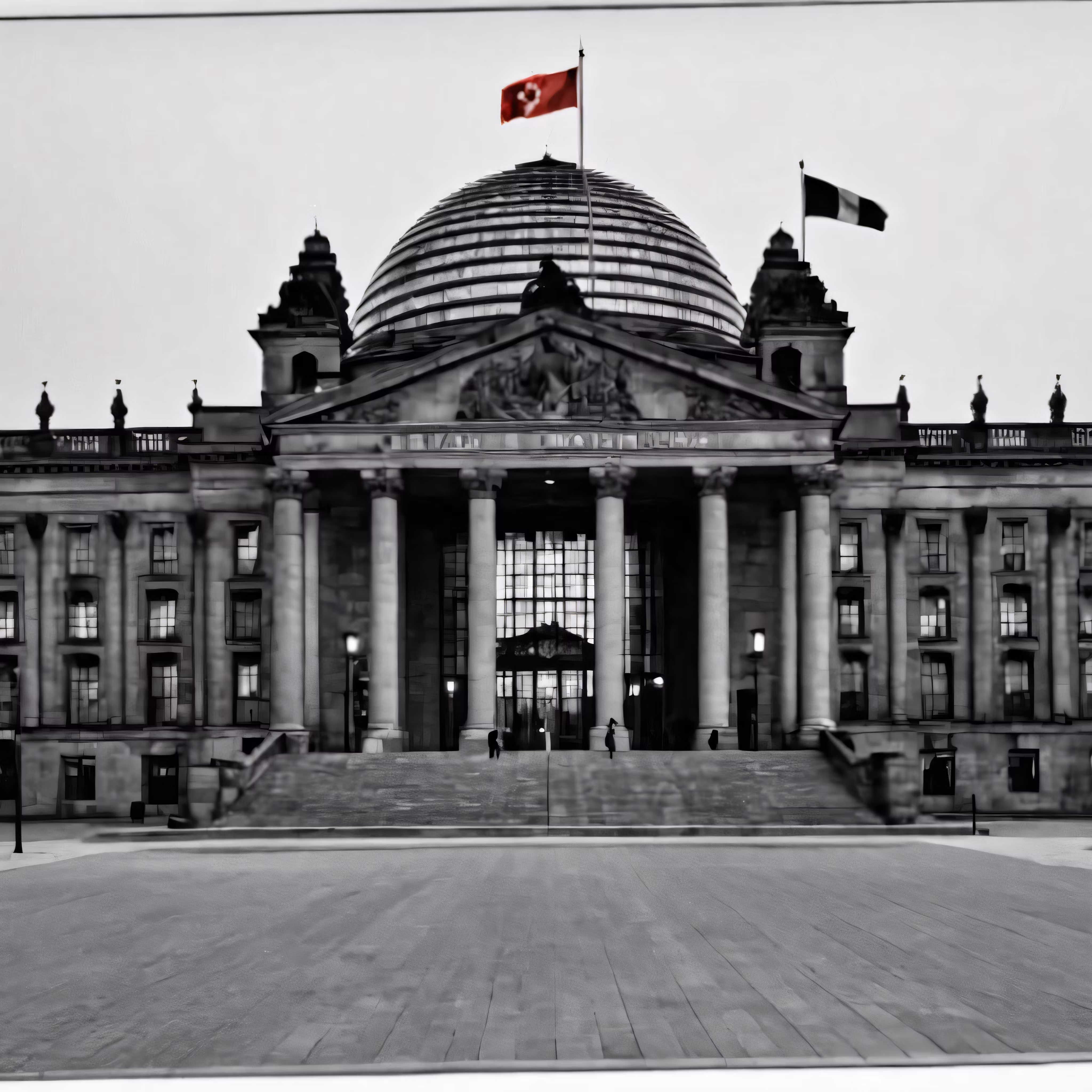 High resolution picture, free to use, a very large building with some flags in front of it