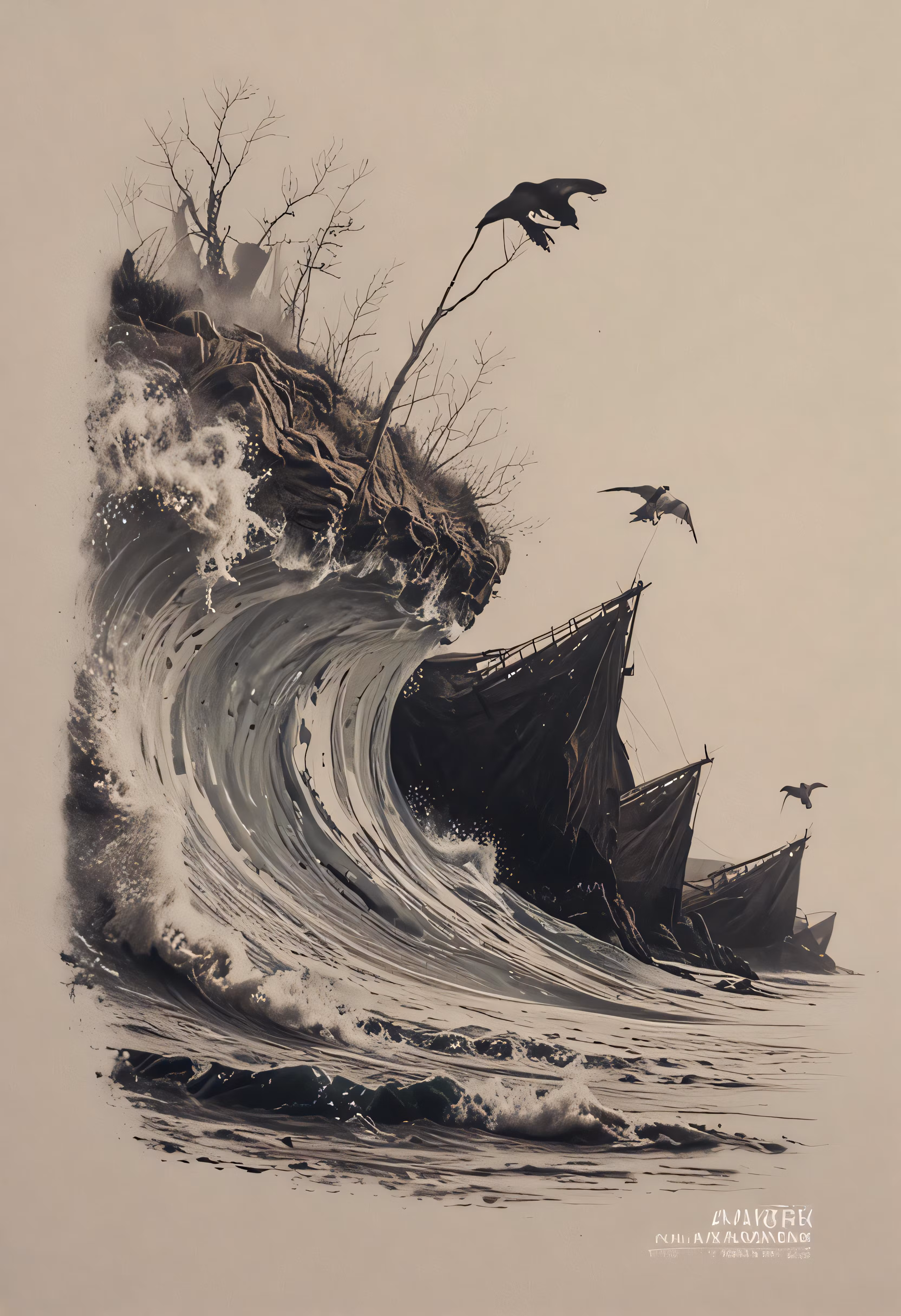 High resolution picture, free to use, a very large wave in the ocean with two boats