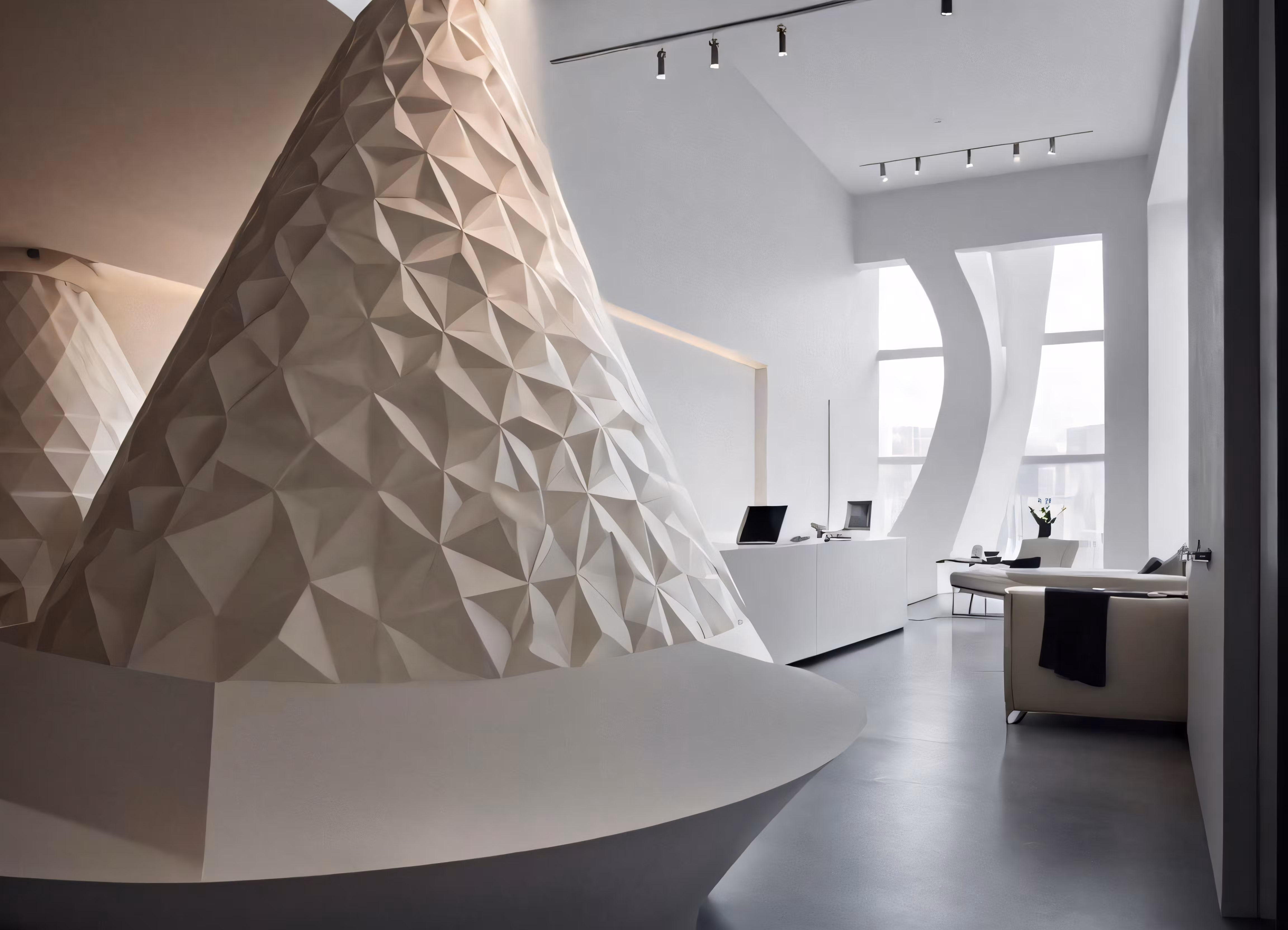 High resolution picture, free to use, a very long white sculpture is in the middle of the room