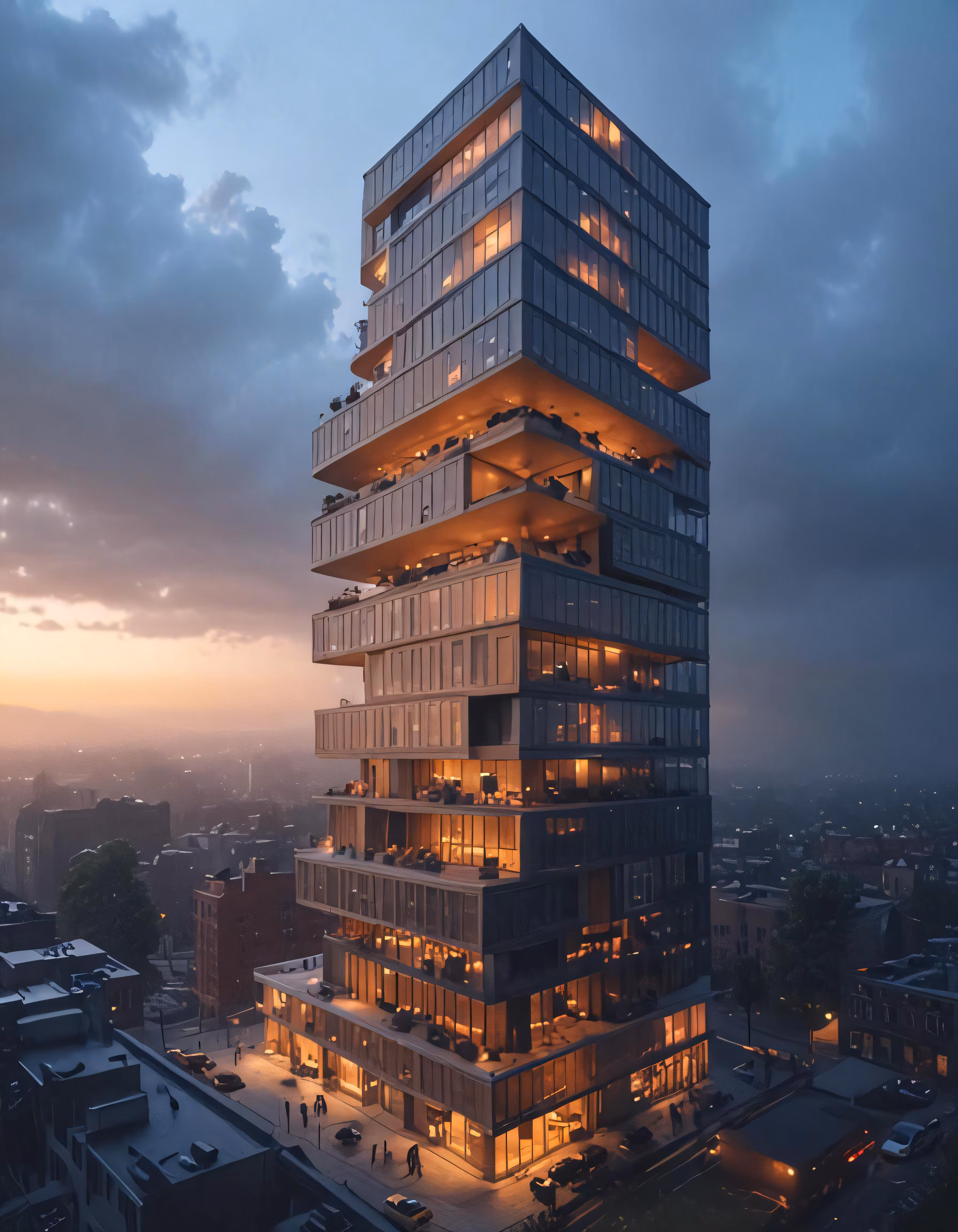 High resolution picture, free to use, a very tall building with lots of windows at dusk
