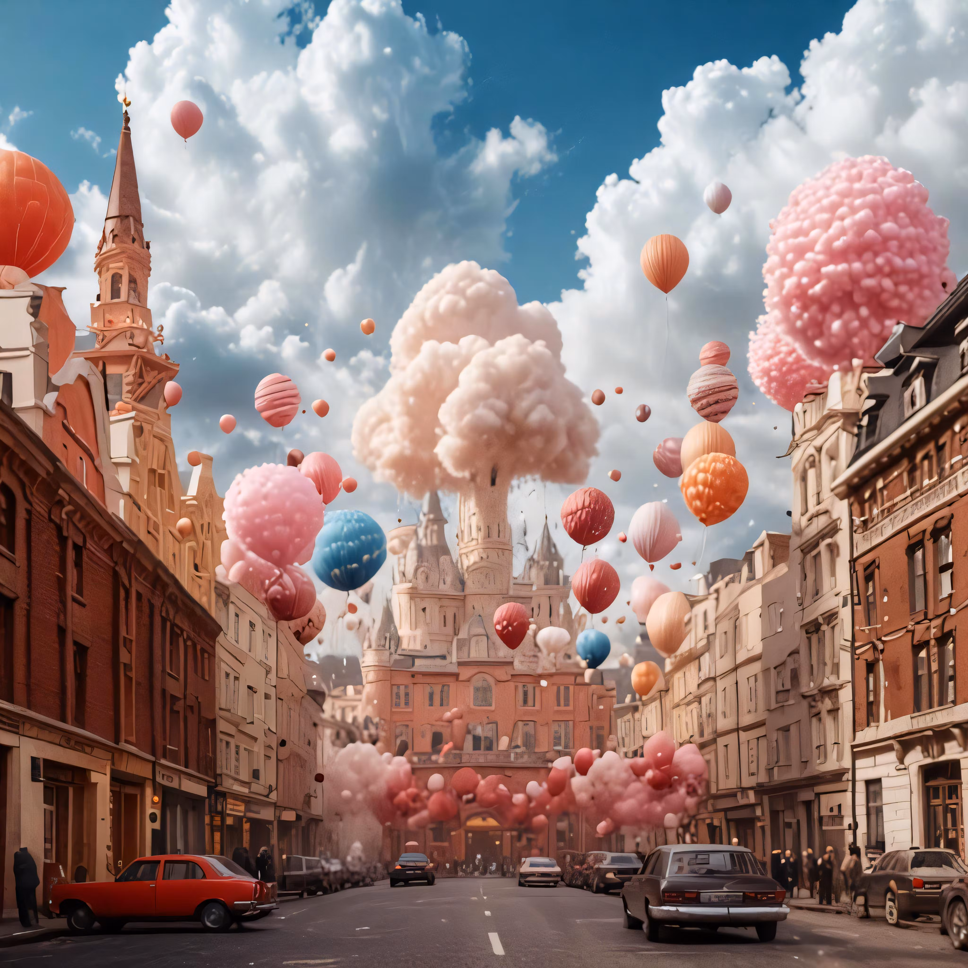 High resolution picture, free to use, a view of a city street with several large clouds in the sky