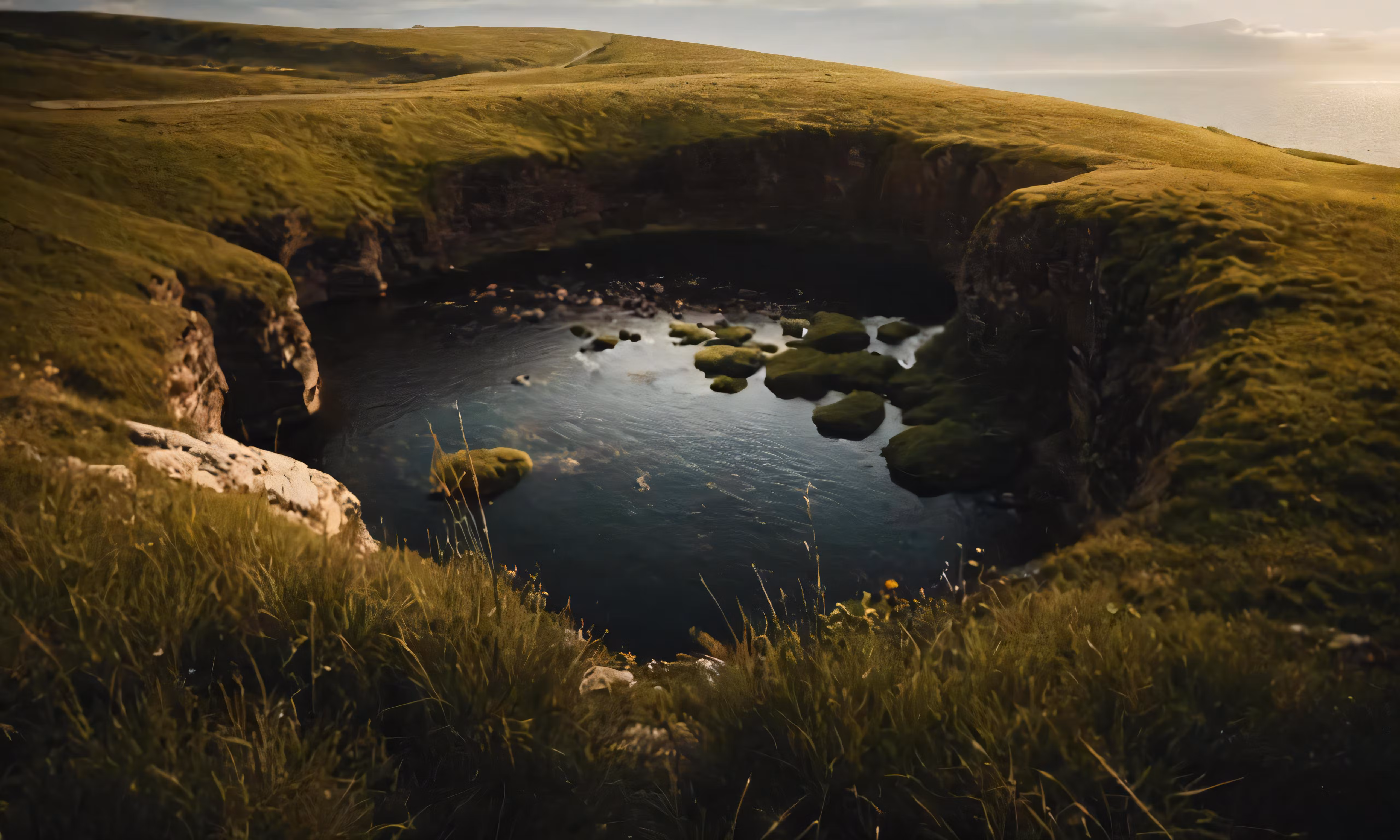 High resolution picture, free to use, a view of an unusual pond sitting next to a cliff