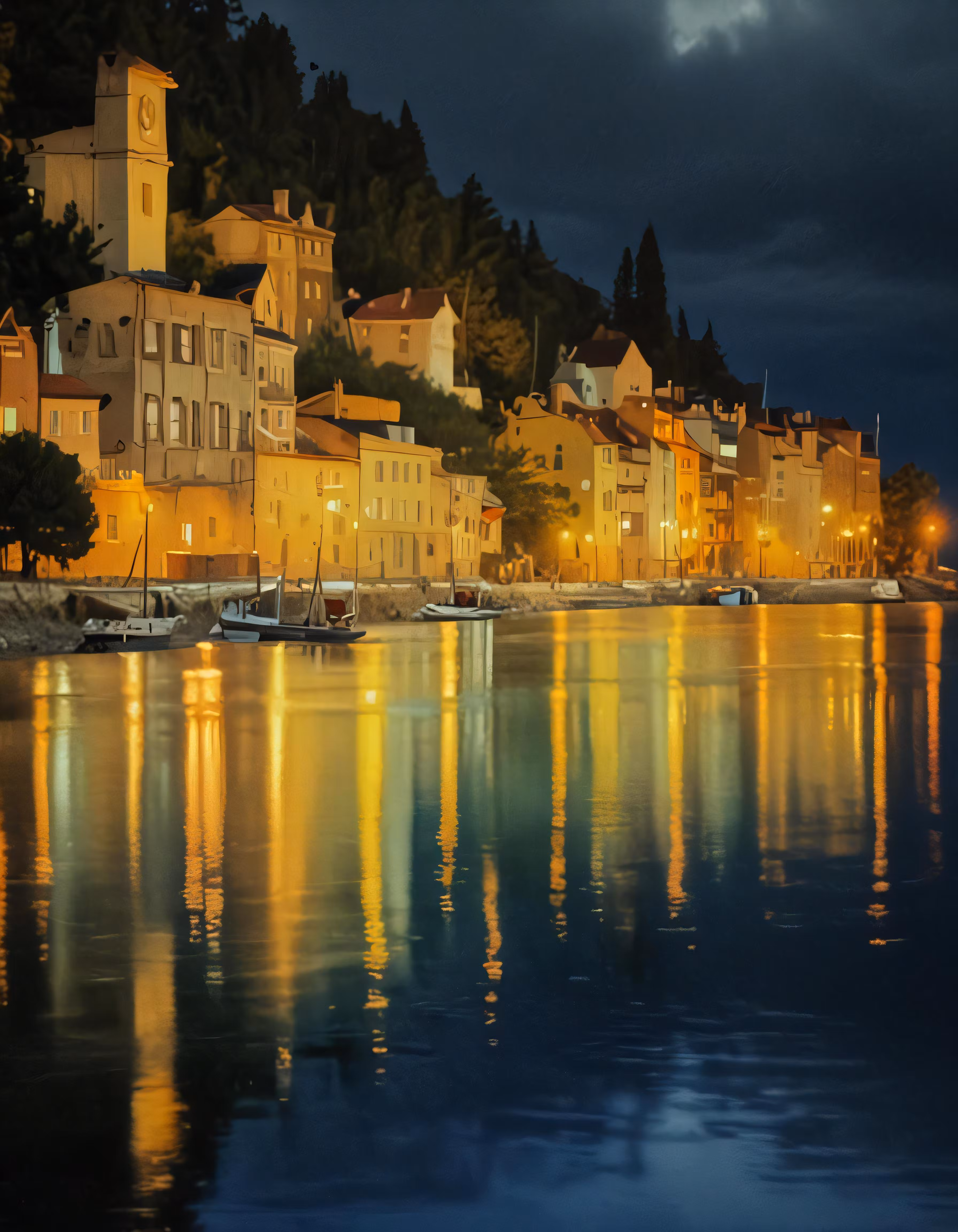 High resolution picture, free to use, a village sits on the edge of a calm river at night