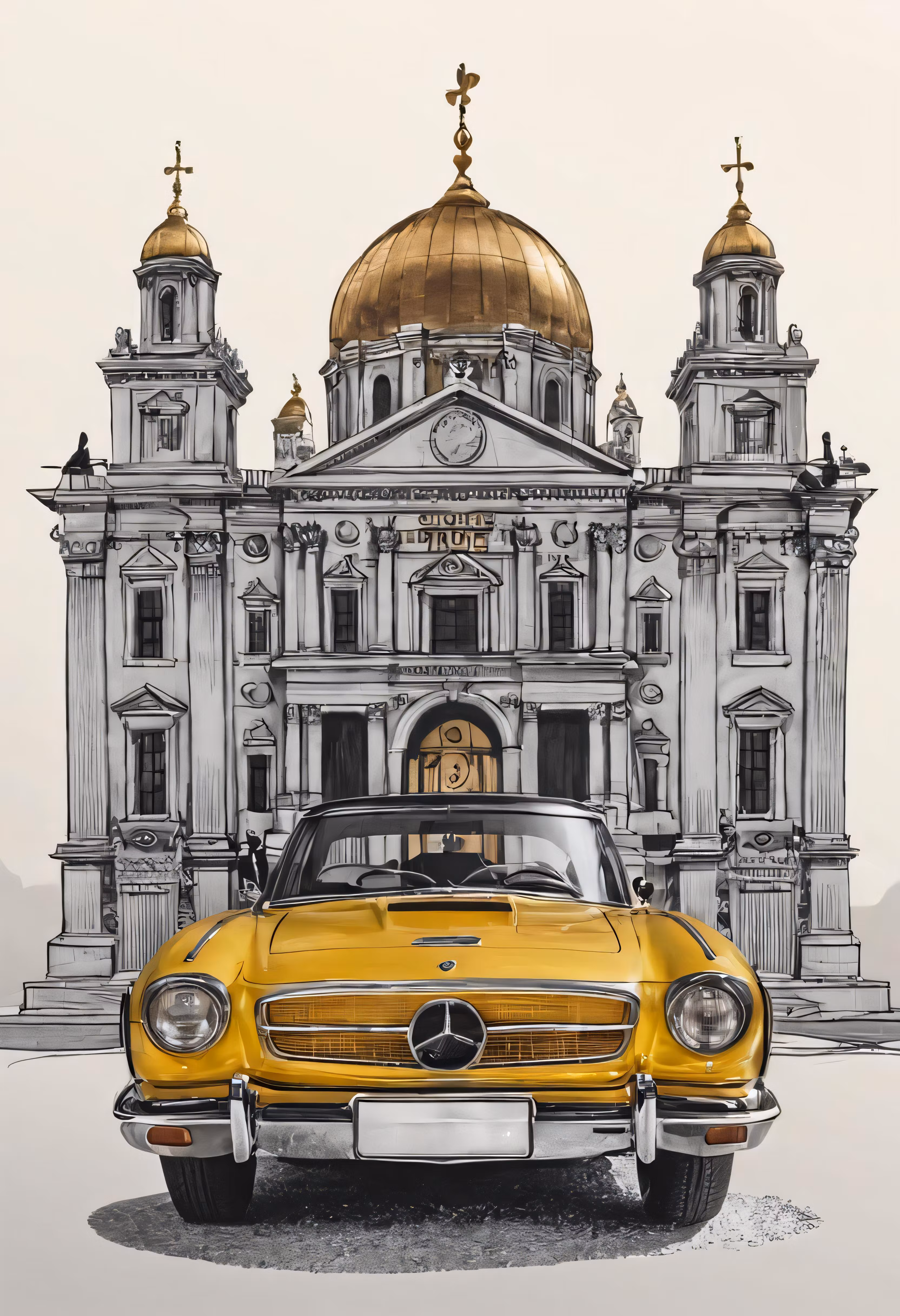 High resolution picture, free to use, a vintage car with an ornate building in the background