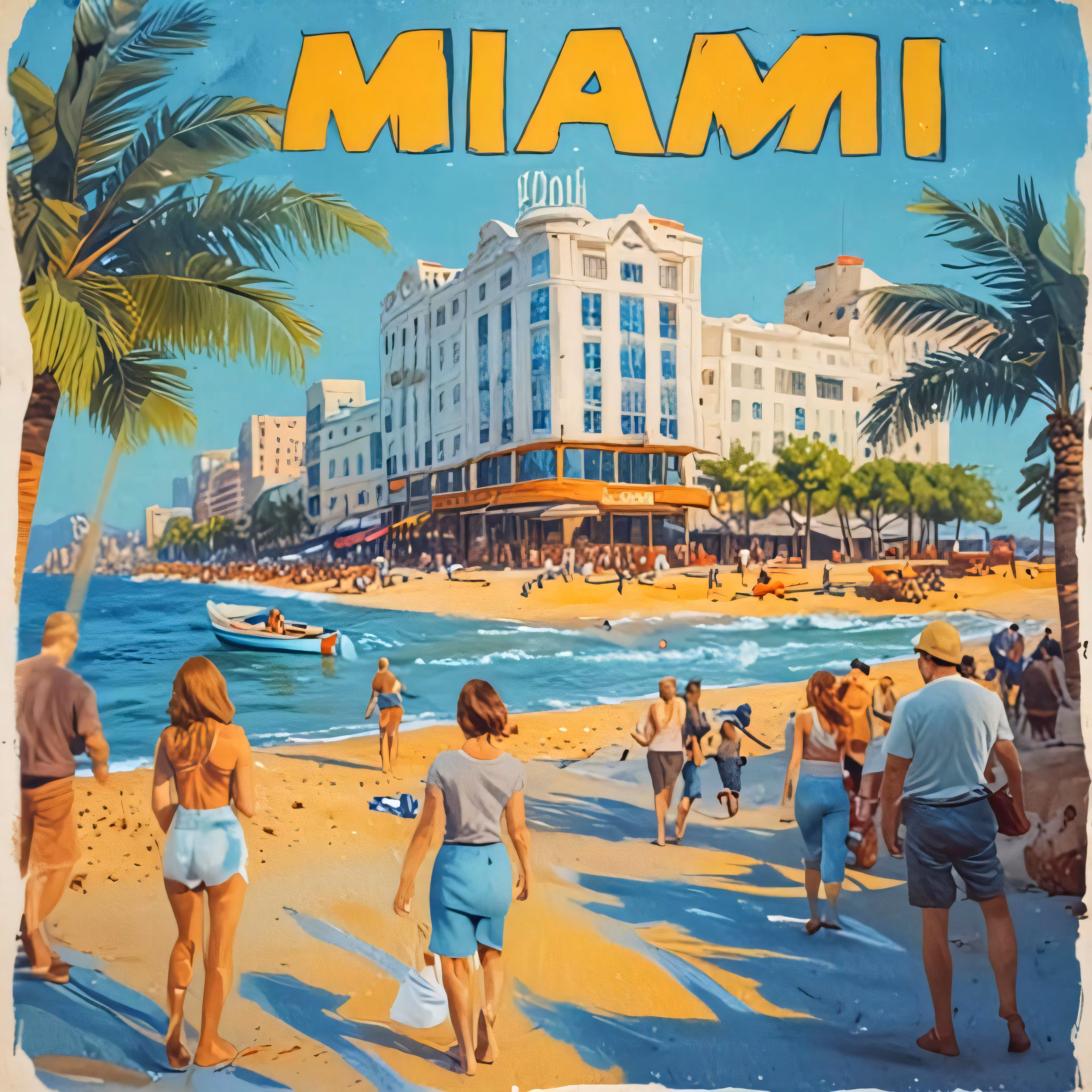 High resolution picture, free to use, a vintage poster shows people on the beach