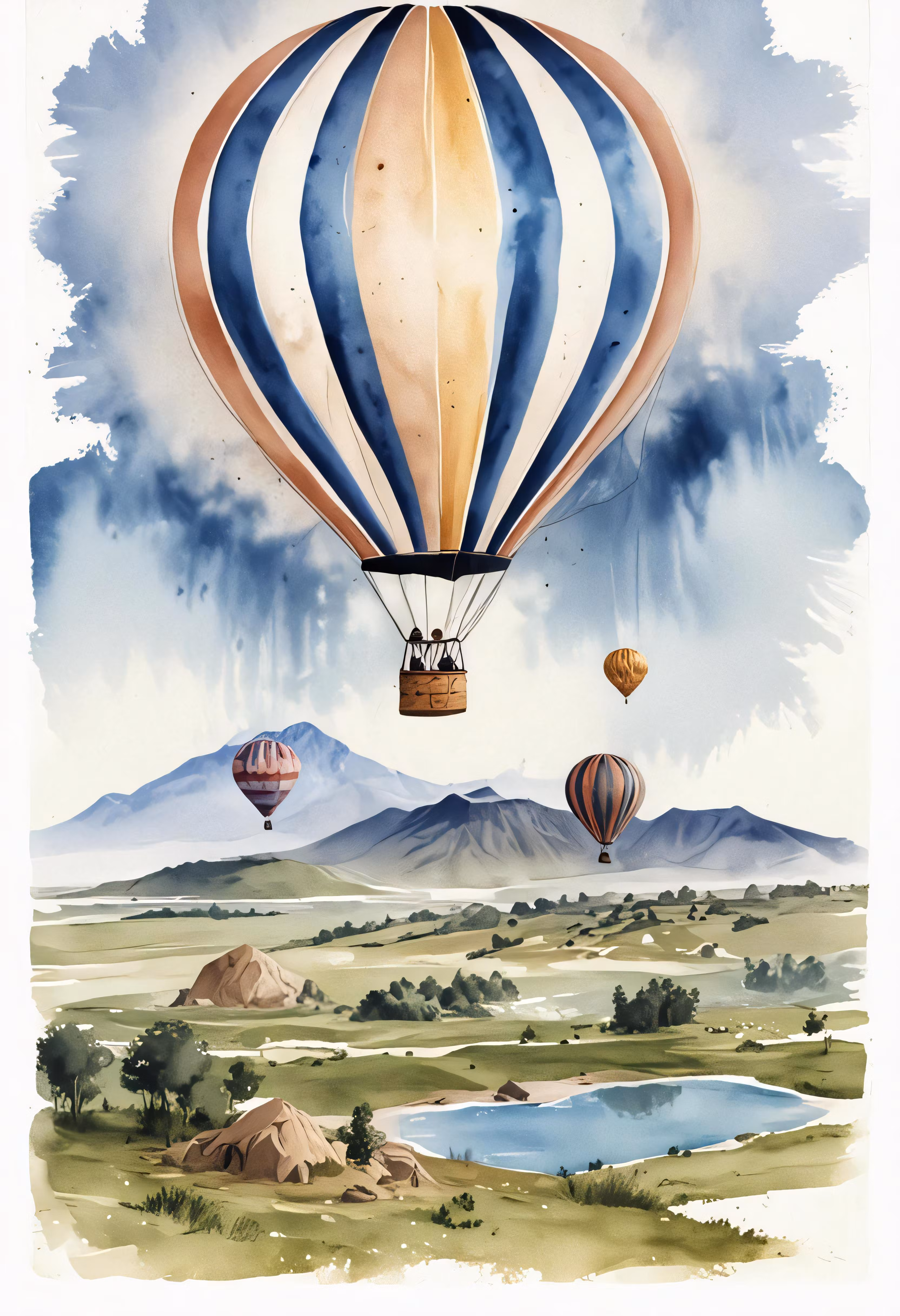 High resolution picture, free to use, a watercolor drawing of hot air balloons over a plain