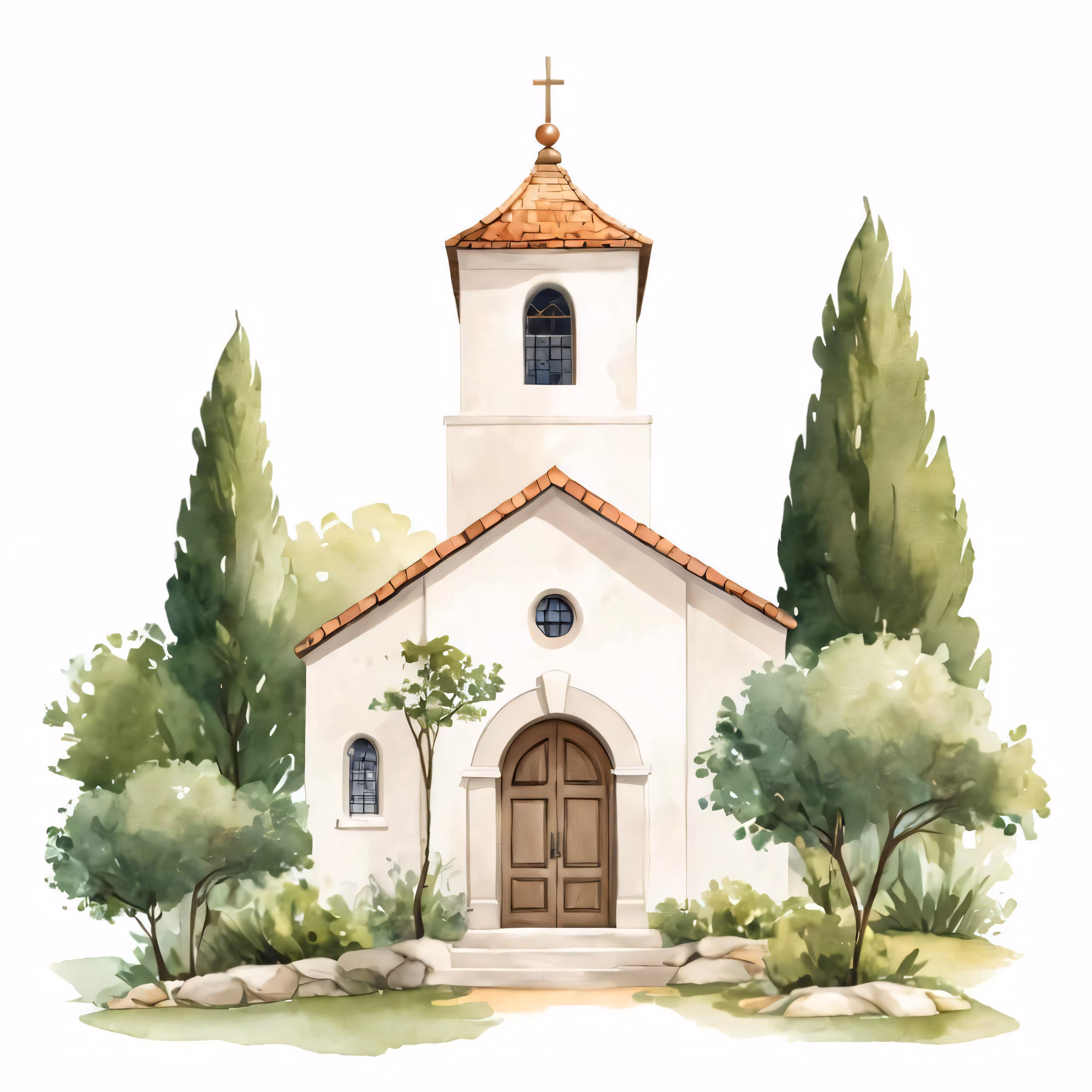 High resolution picture, free to use, a watercolor painting of a church with trees