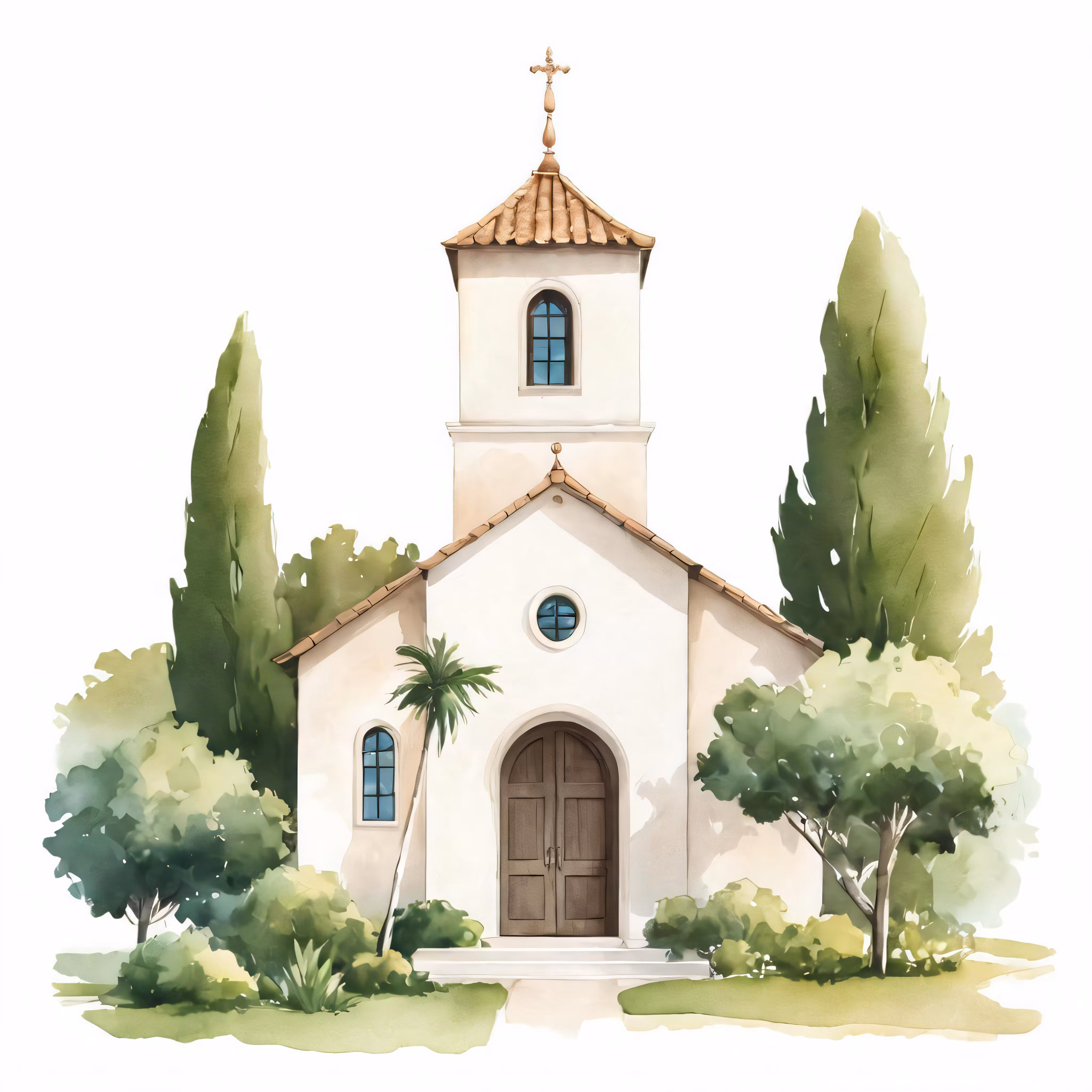 High resolution picture, free to use, a watercolor painting of a small church with a cross on top