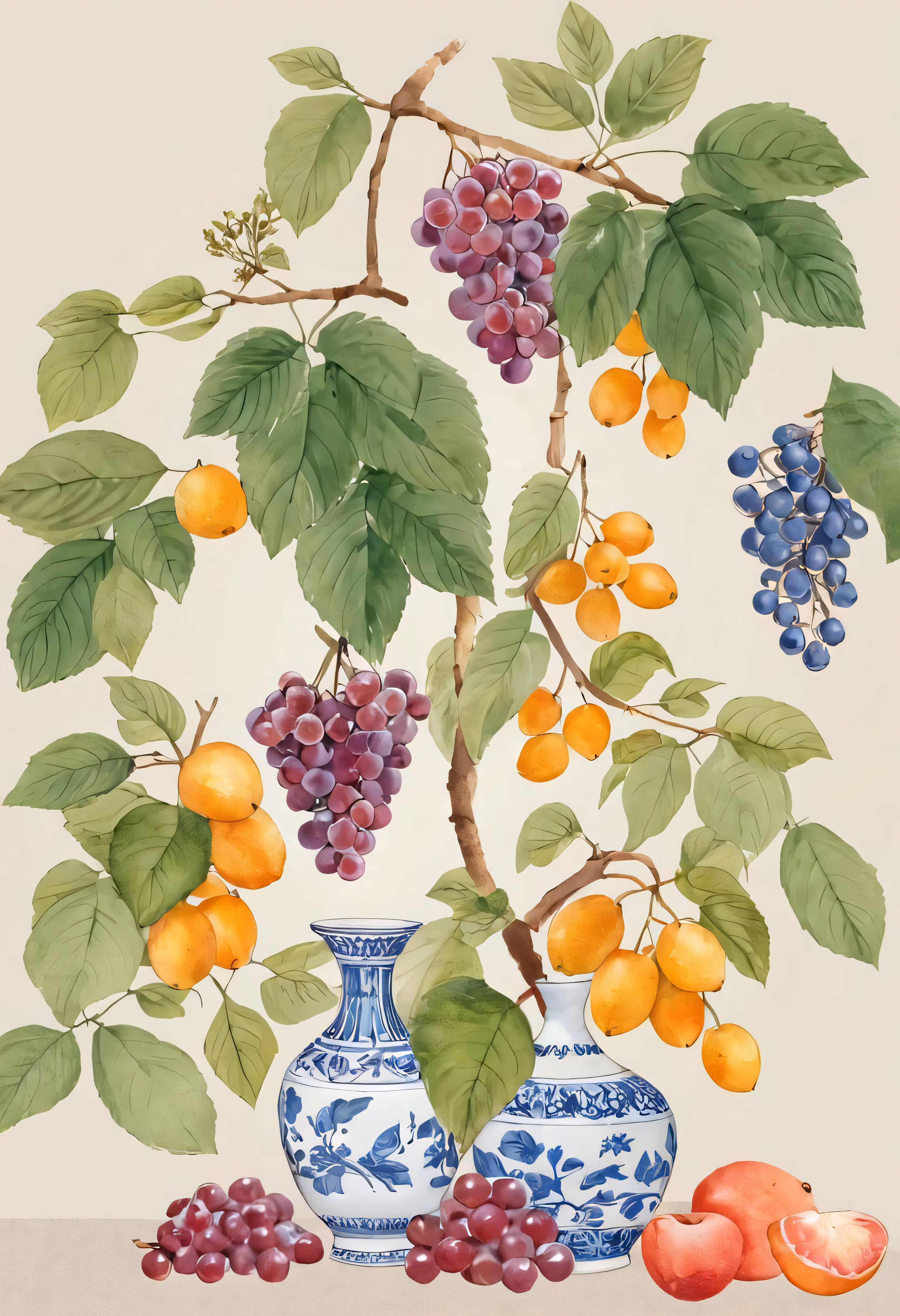 High resolution picture, free to use, a watercolor painting of blue and white ceramic vases and fruit with leaves and oranges on them