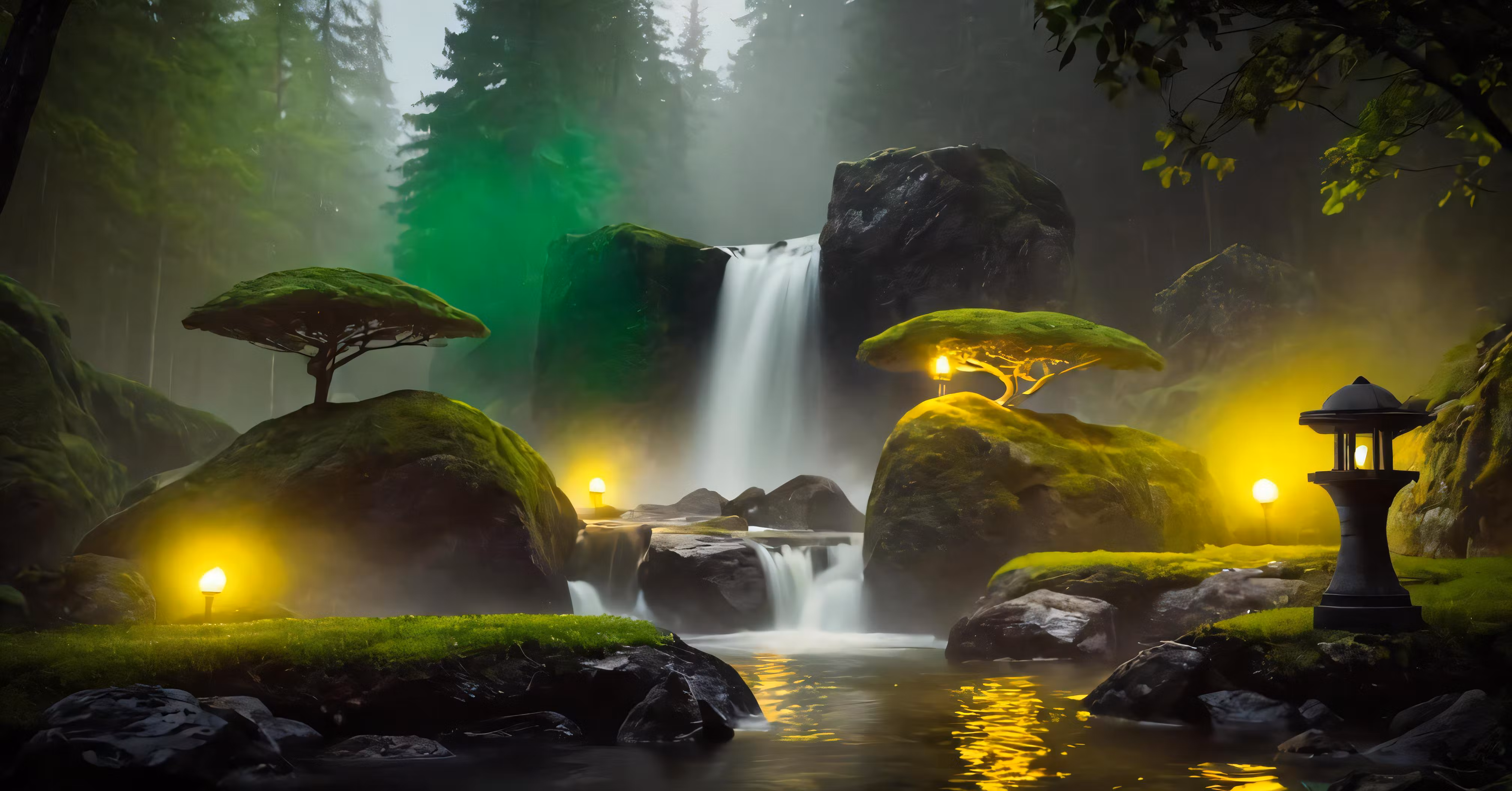 High resolution picture, free to use, a waterfall, a lamp, a bridge and some rocks in the woods