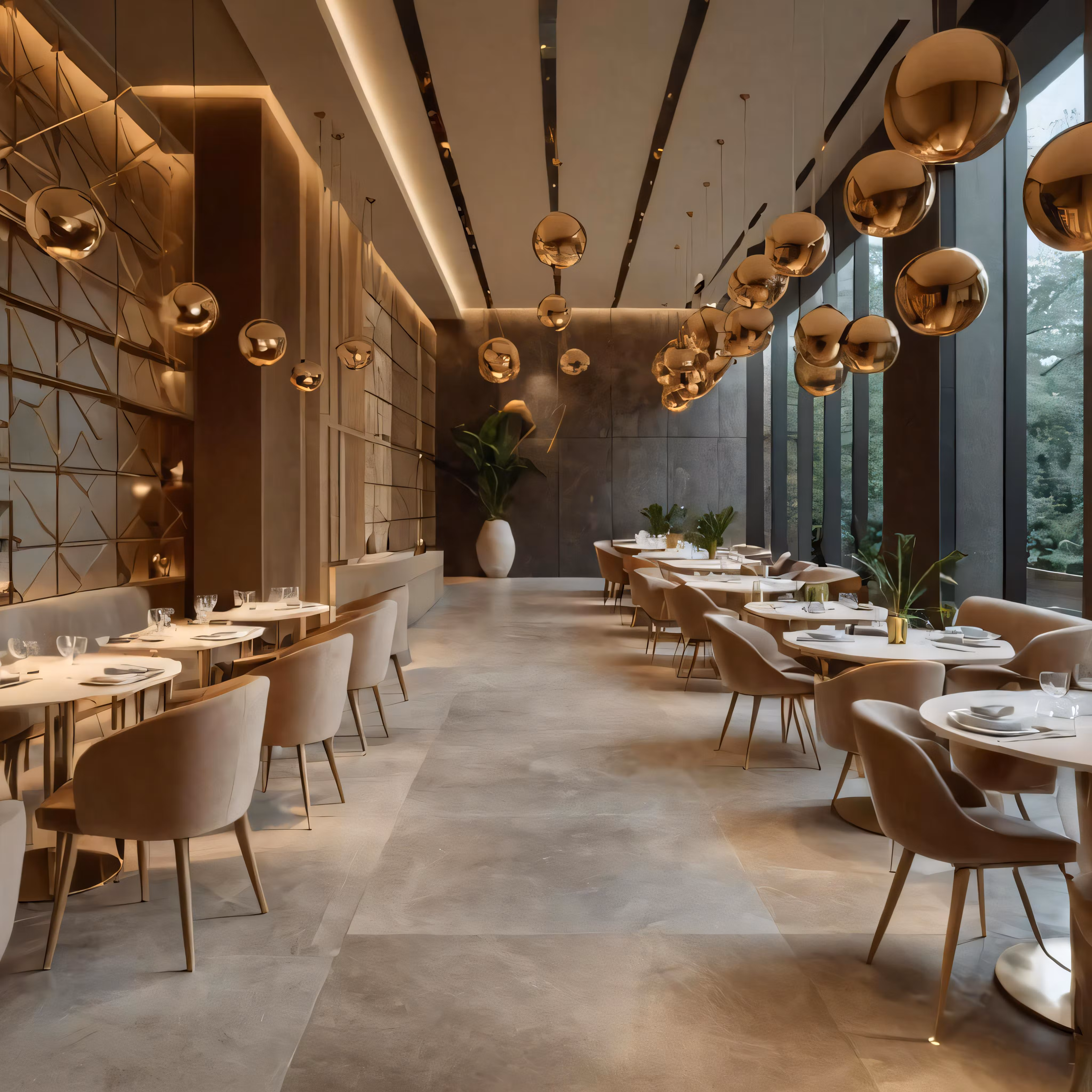 High resolution picture, free to use, a well lit restaurant with modern furniture and elegant lighting