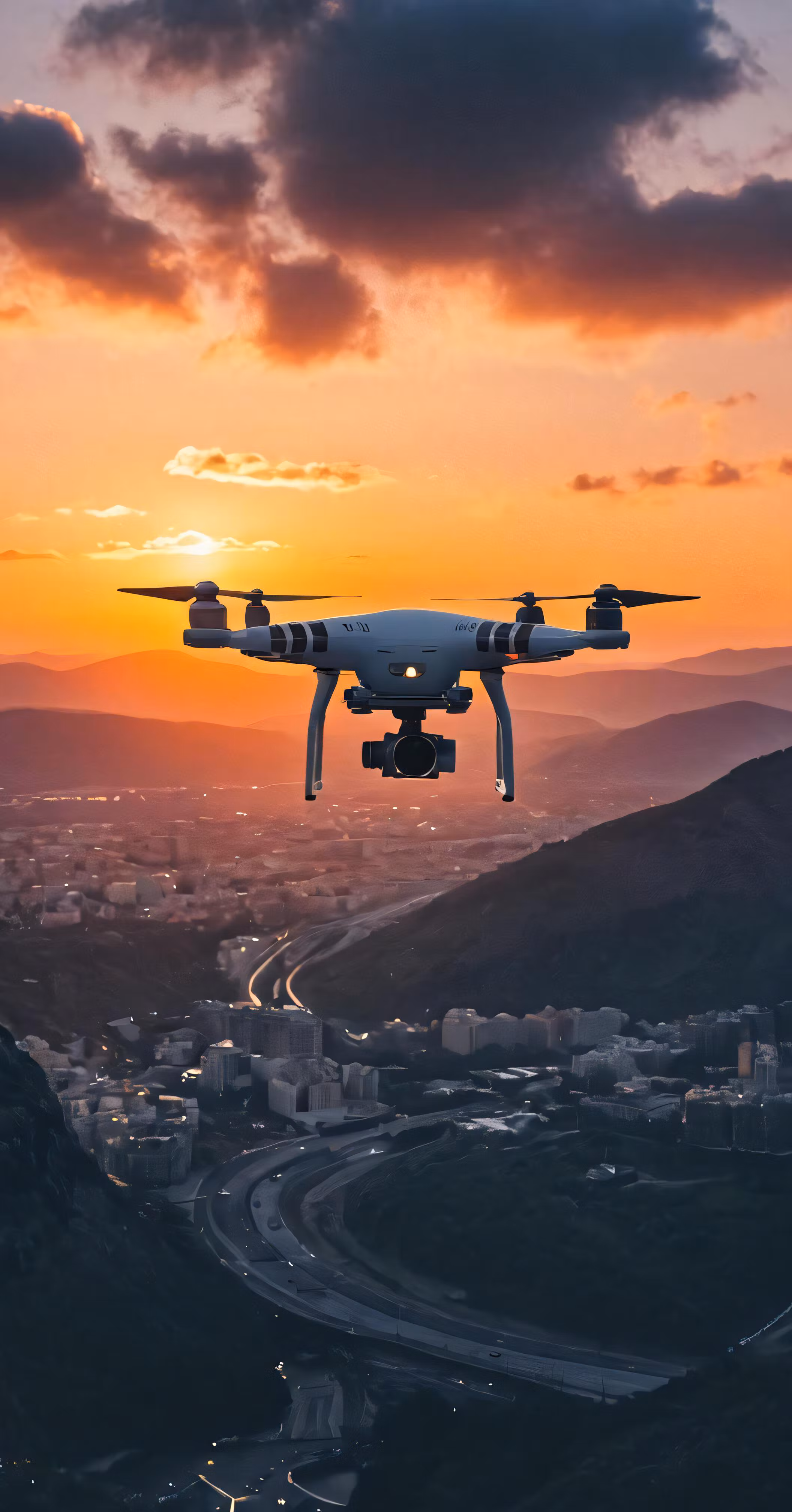 High resolution picture, free to use, a white airplane flying over a city with a sunset in the background