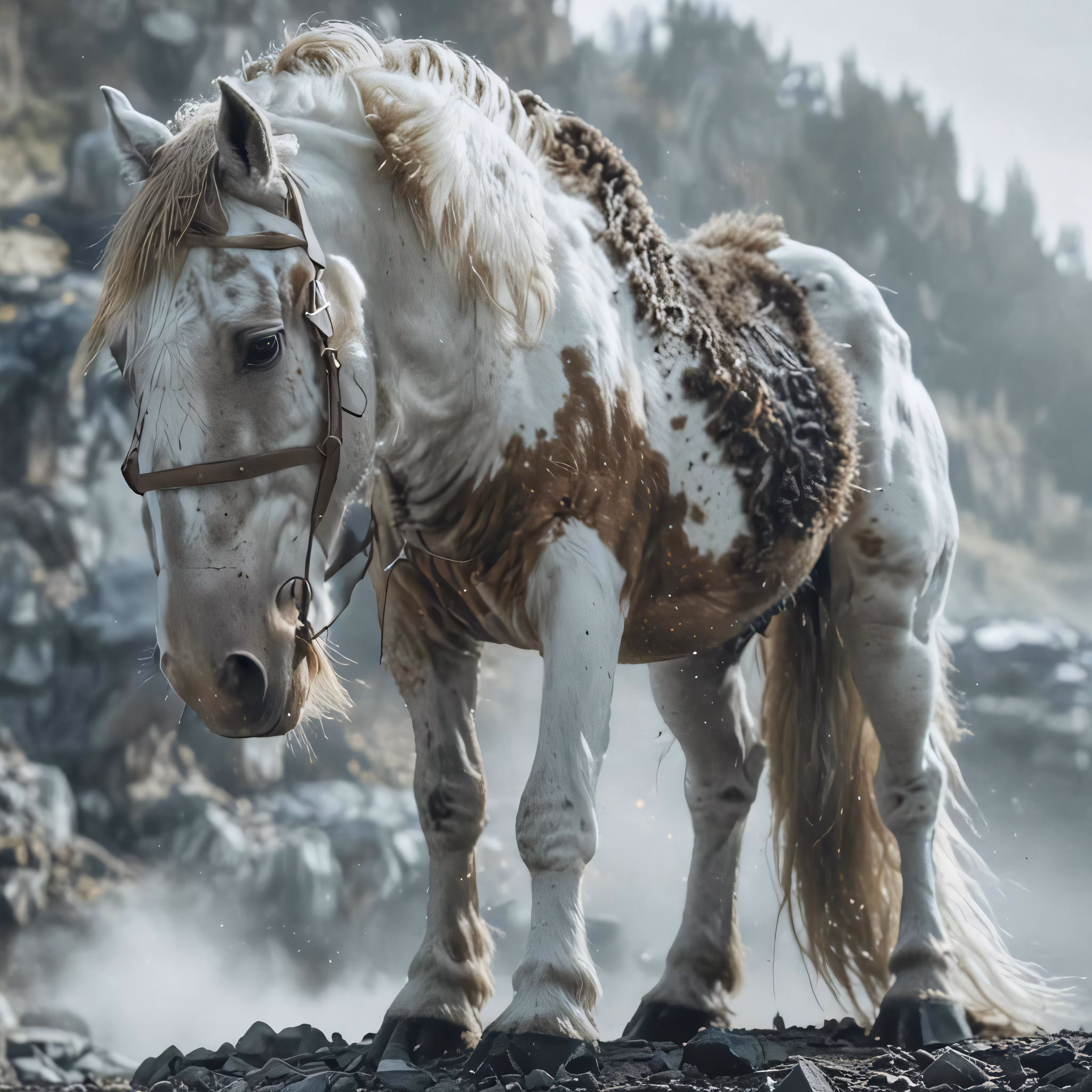 High resolution picture, free to use, a white and brown horse with a white head is standing in some rocks