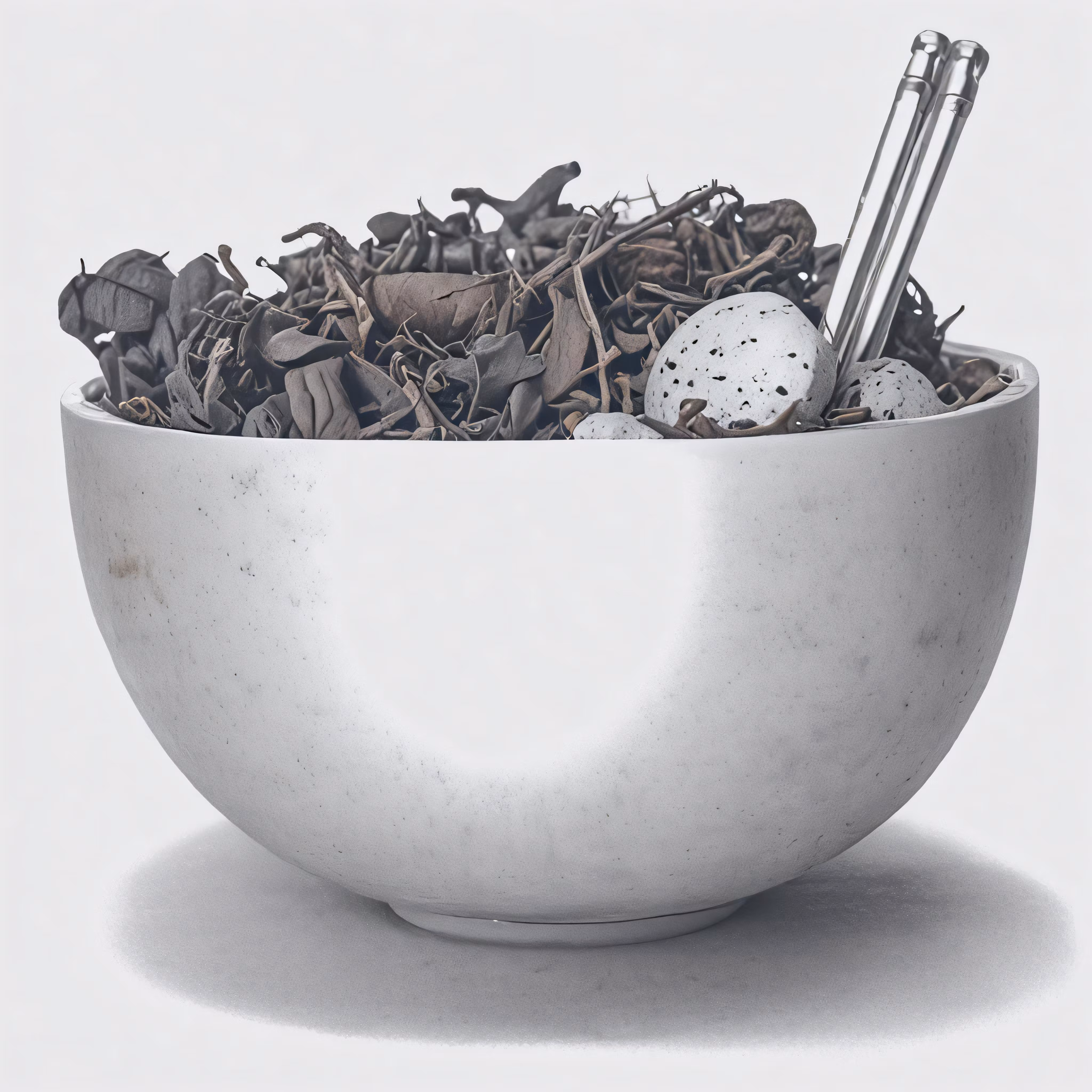 High resolution picture, free to use, a white bowl filled with lots of leaves and eggs