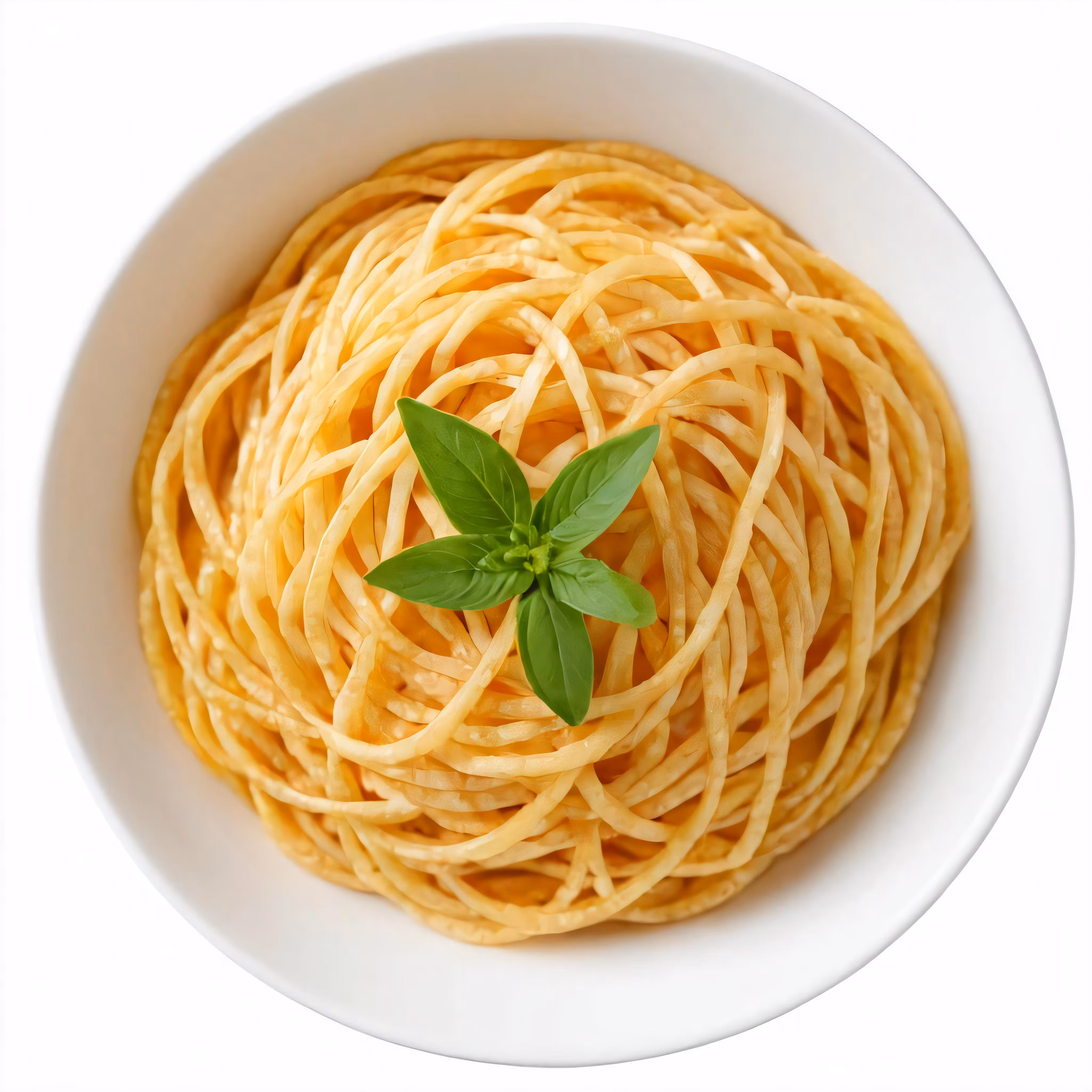 High resolution picture, free to use, a white bowl filled with spaghetti and topped with a green leaf