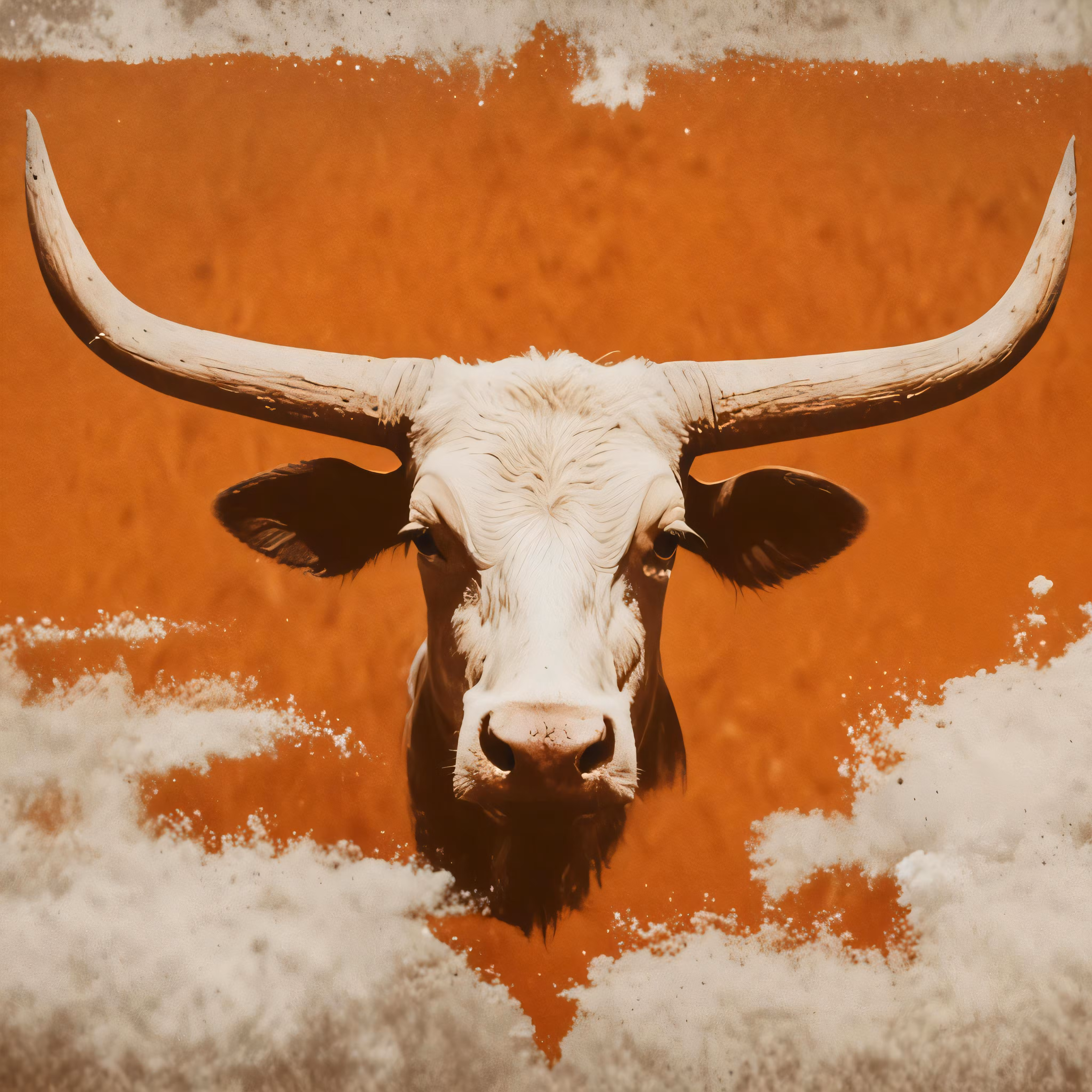 High resolution picture, free to use, a white bull with long horns against an orange sky