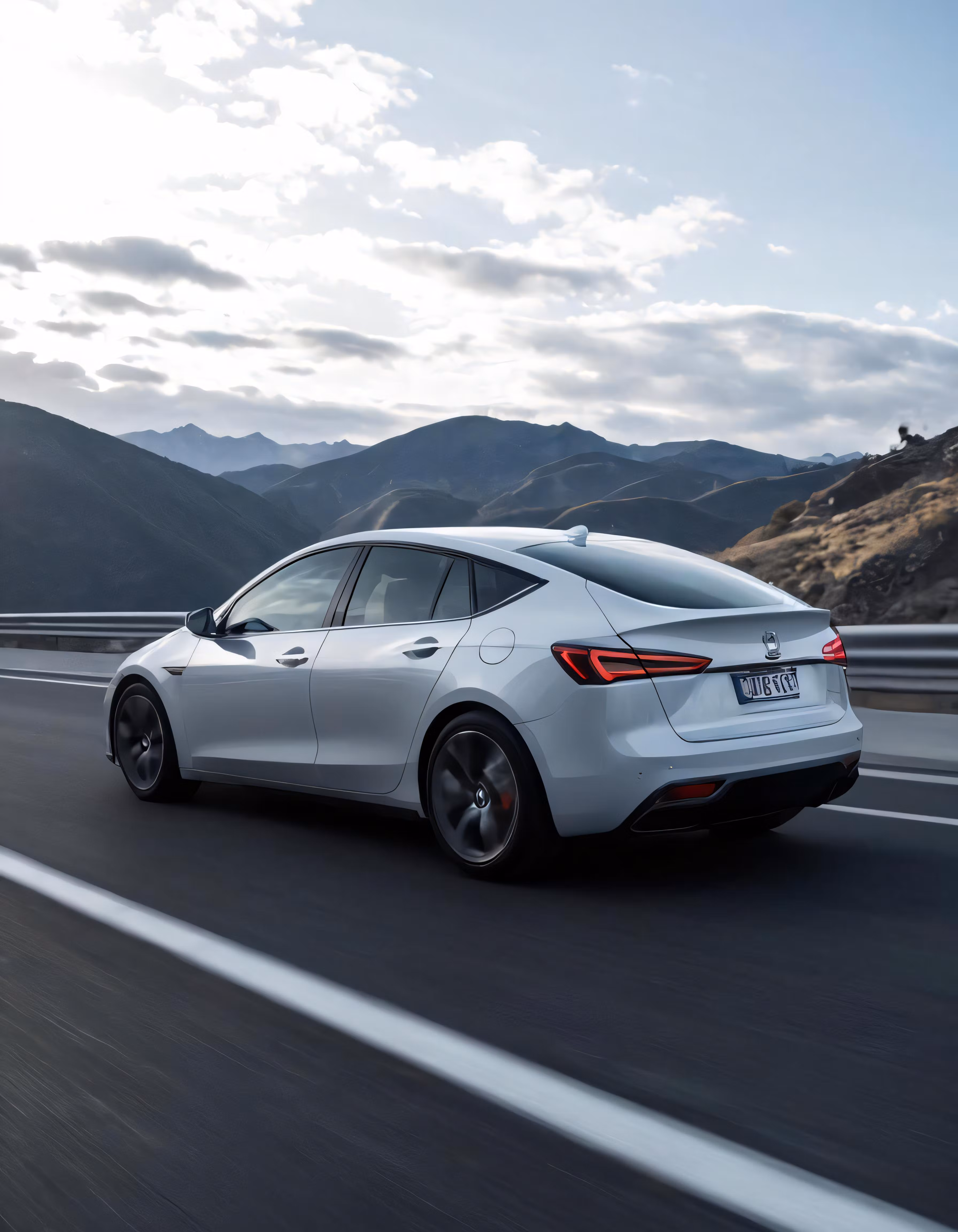 High resolution picture, free to use, a white car driving down a street by some hills